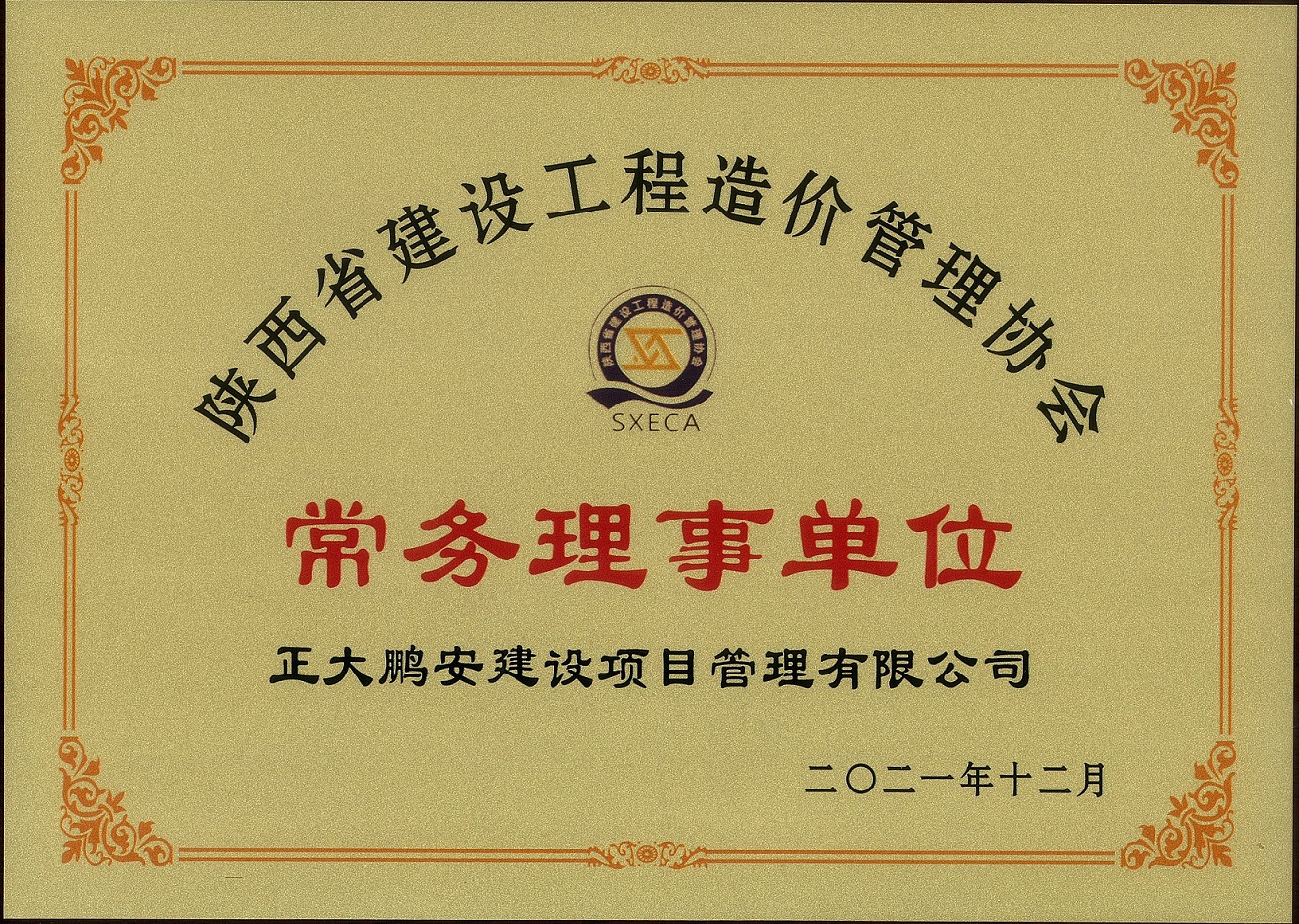 2021年9月,經(jīng)陜西省建設(shè)工程造價(jià)管理協(xié)會(huì)專家委員會(huì)評(píng)審,正大鵬安建設(shè)項(xiàng)目管理有限公司榮獲“陜西省建設(shè)工程造價(jià)管理協(xié)會(huì)常務(wù)理事單位”。