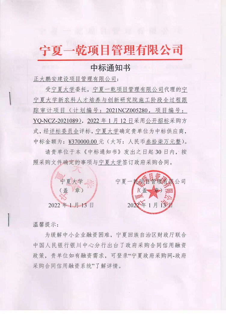 近日,我公司參與了“寧夏大學(xué)新農(nóng)科人才培養(yǎng)與創(chuàng)新研究院施工階段全過程跟蹤審計(jì)項(xiàng)目”項(xiàng)目的投標(biāo),經(jīng)評標(biāo)委員會綜合評審,招標(biāo)人確認(rèn),正大鵬安建設(shè)項(xiàng)目管理有限公司被確認(rèn)為中標(biāo)供應(yīng)商。