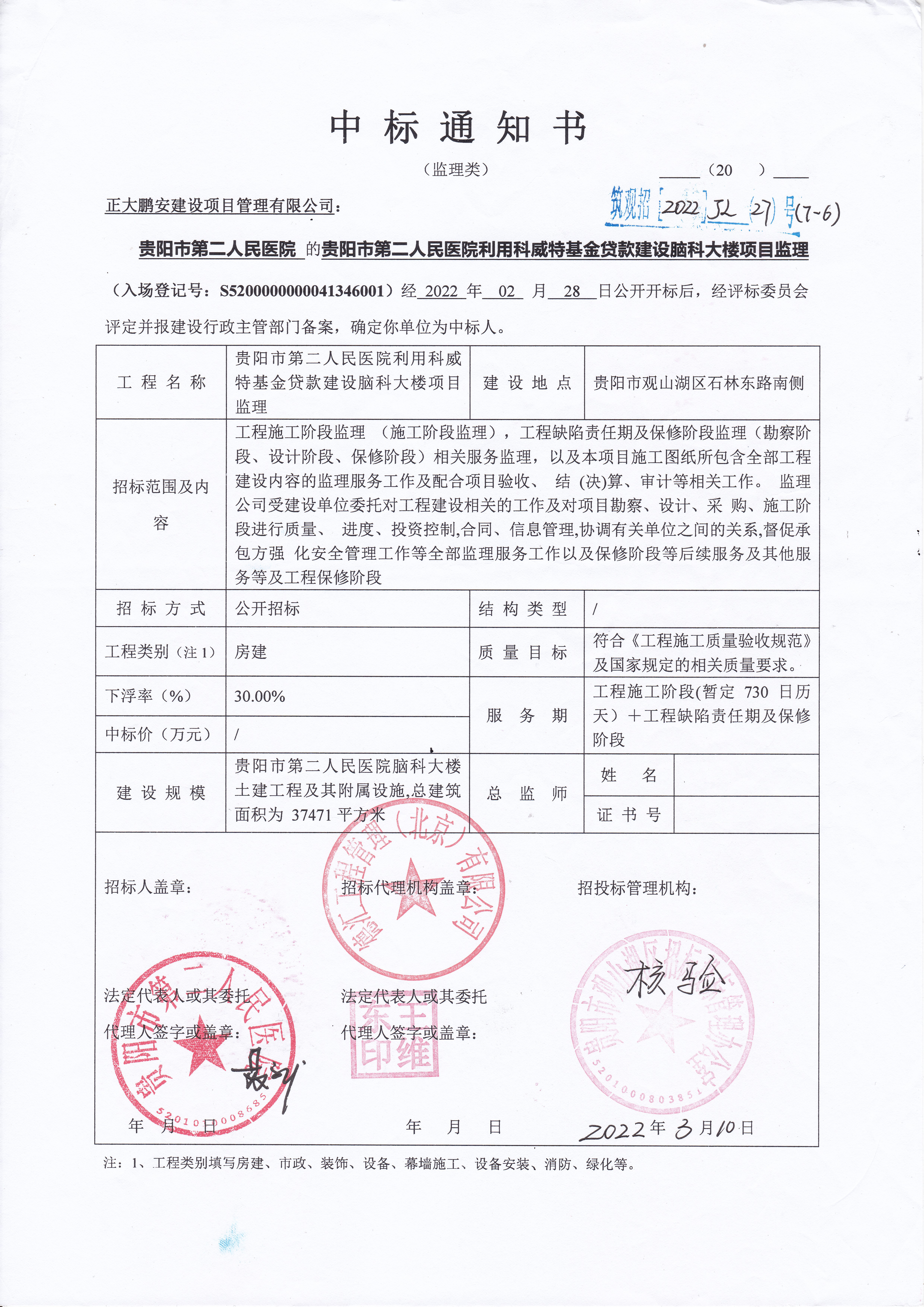 2022年3月,經(jīng)評標(biāo)委員會評定,招標(biāo)人確認,正大鵬安建設(shè)項目管理有限公司中標(biāo)貴陽市第二人民醫(yī)院的“貴陽市第二人民醫(yī)院利用科威特基金貸款建設(shè)腦科大樓項目監(jiān)理”項目。