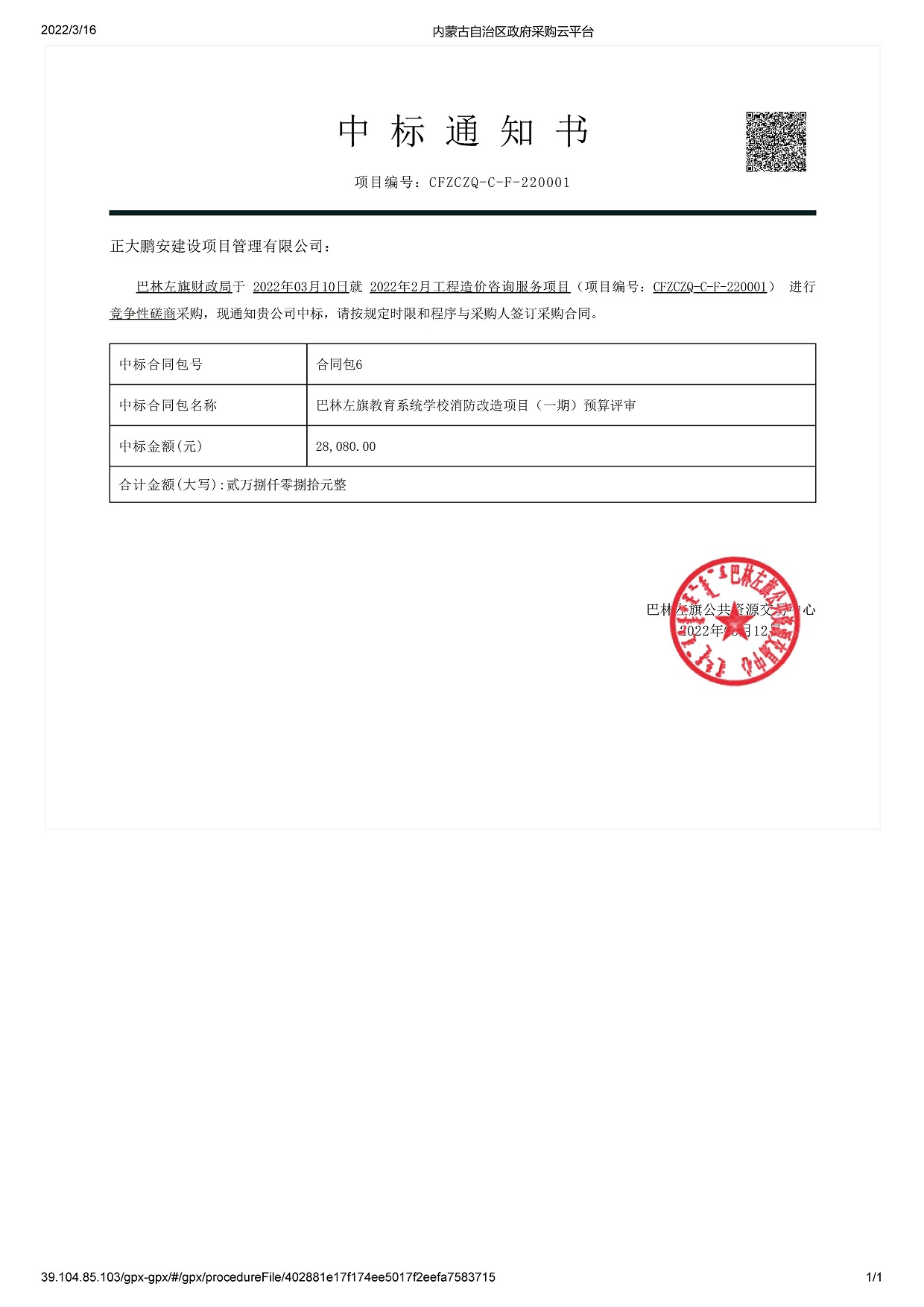 正大鵬安中標(biāo)巴林左旗財政局2022年2月工程造價咨詢服務(wù)項目合同包6(巴林左旗教育系統(tǒng)學(xué)校消防改造項目(一期)預(yù)算評審)