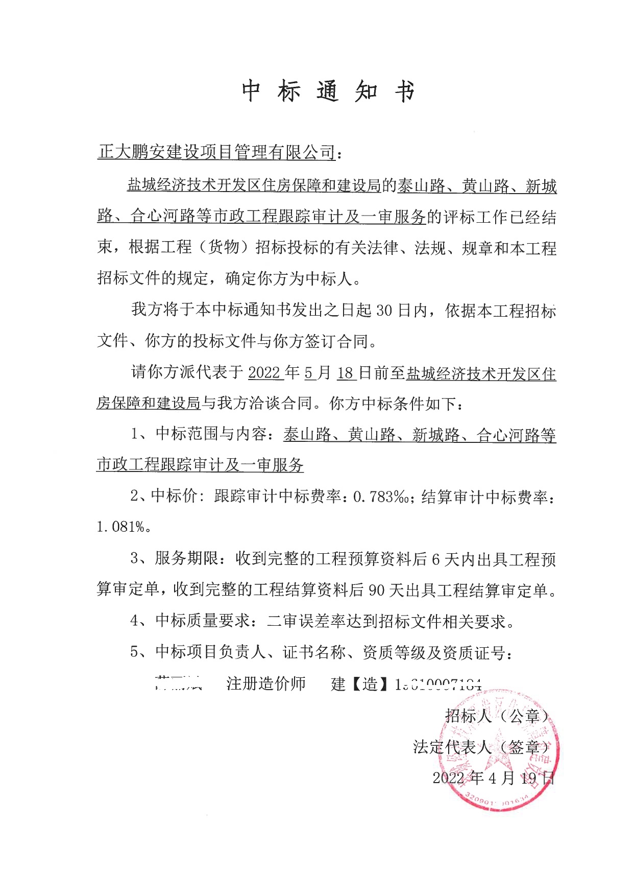 2022年4月,經(jīng)評(píng)標(biāo)委員會(huì)評(píng)定,招標(biāo)人確認(rèn),正大鵬安建設(shè)項(xiàng)目管理有限公司中標(biāo)“泰山路、黃山路、新城路、合心河路等市政工程跟蹤審計(jì)及一審服務(wù)項(xiàng)目”。