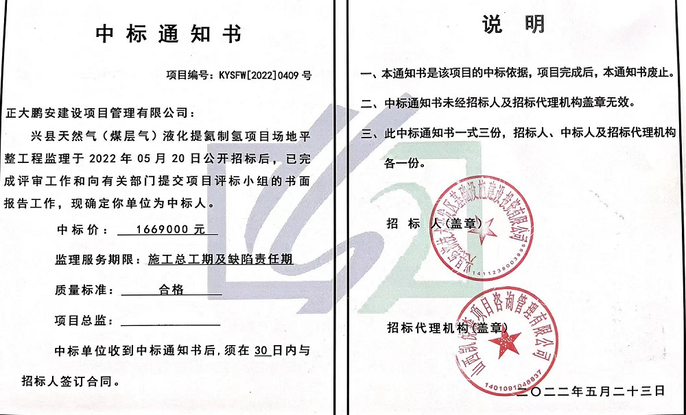 正大鵬安中標(biāo)興縣天然氣(煤層氣)液化提氦制氫項(xiàng)目場(chǎng)地平整工程監(jiān)理
