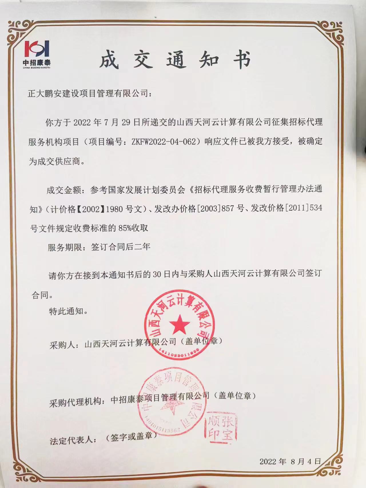 正大鵬安中標(biāo)山西天河云計(jì)算有限公司征集招標(biāo)代理服務(wù)機(jī)構(gòu)項(xiàng)目