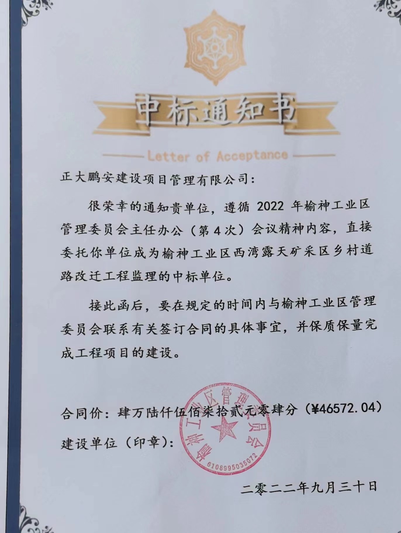 2022年9月,經(jīng)評標委員會綜合評審,招標確認,正大鵬安建設(shè)項目管理有限公司中標榆神工業(yè)區(qū)西灣露天礦采區(qū)鄉(xiāng)村道路改遷工程監(jiān)理項目”