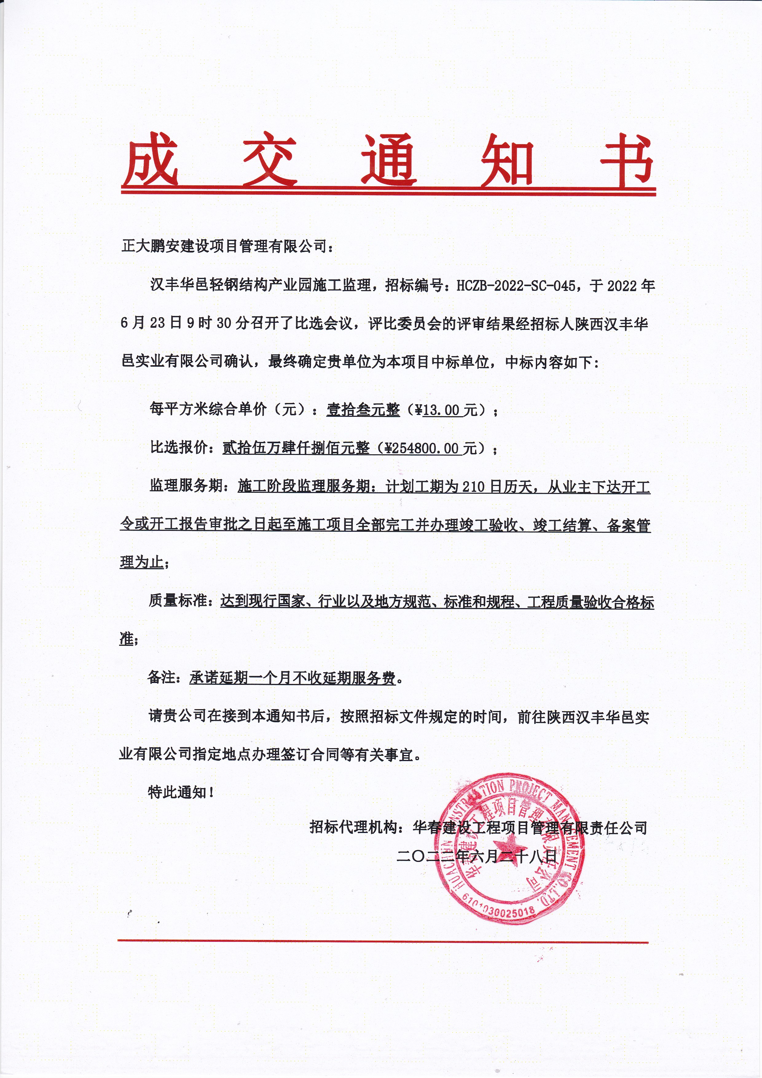 近日,我公司參與”漢豐華邑輕鋼結(jié)構(gòu)產(chǎn)業(yè)園施工監(jiān)理項目”,經(jīng)評審委員會綜合評審,招標(biāo)人確認(rèn),正大鵬安公司中標(biāo)。