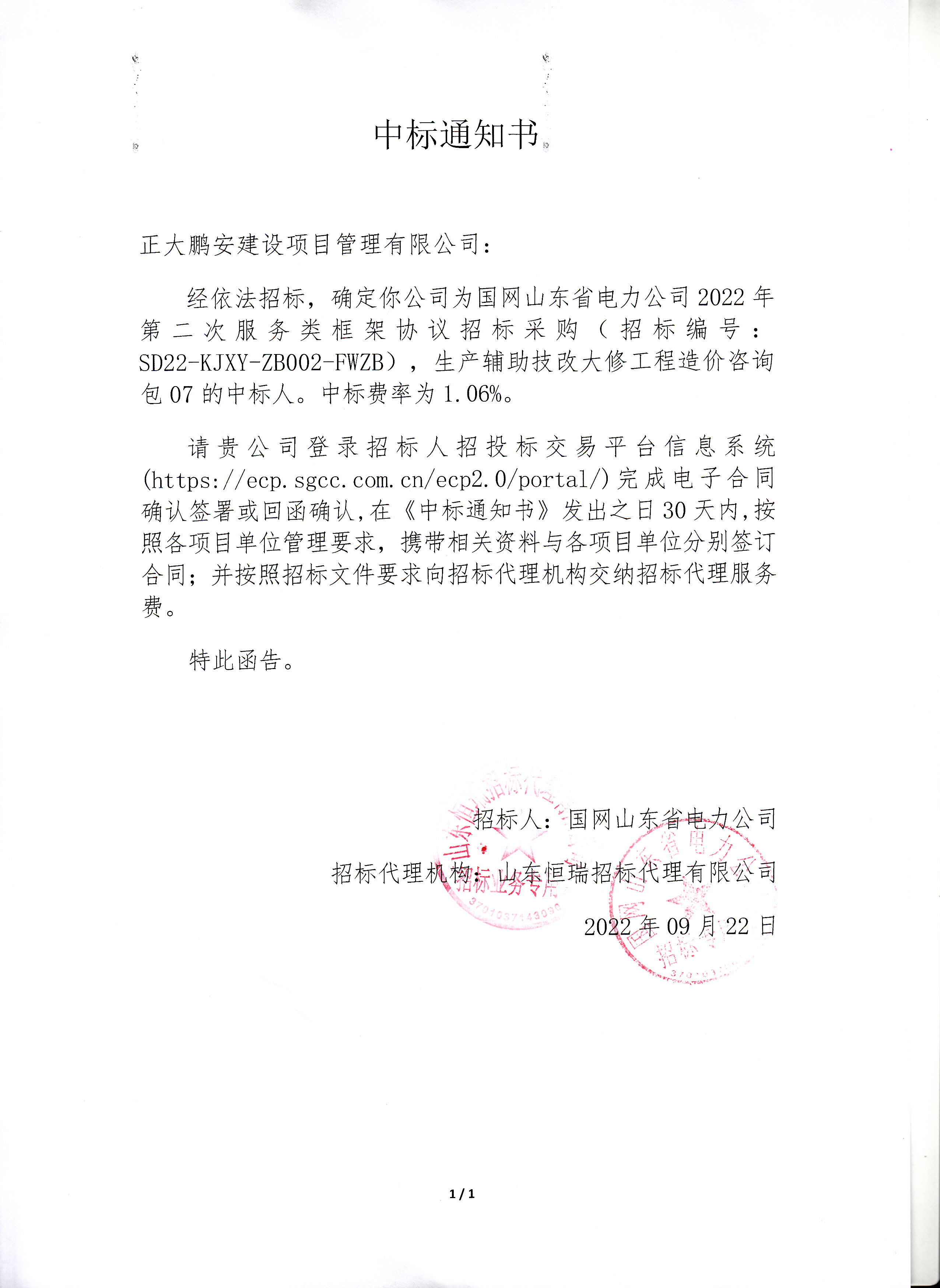 近日,我公司參與”國(guó)網(wǎng)山東省電力公司2022年第二次服務(wù)類框架協(xié)議招標(biāo)采購(gòu)中中標(biāo)生產(chǎn)輔助技改大修工程造價(jià)咨詢包07”項(xiàng)目,經(jīng)評(píng)審委員會(huì)綜合評(píng)審,招標(biāo)人確認(rèn),正大鵬安建設(shè)項(xiàng)目管理有限公司中標(biāo)。