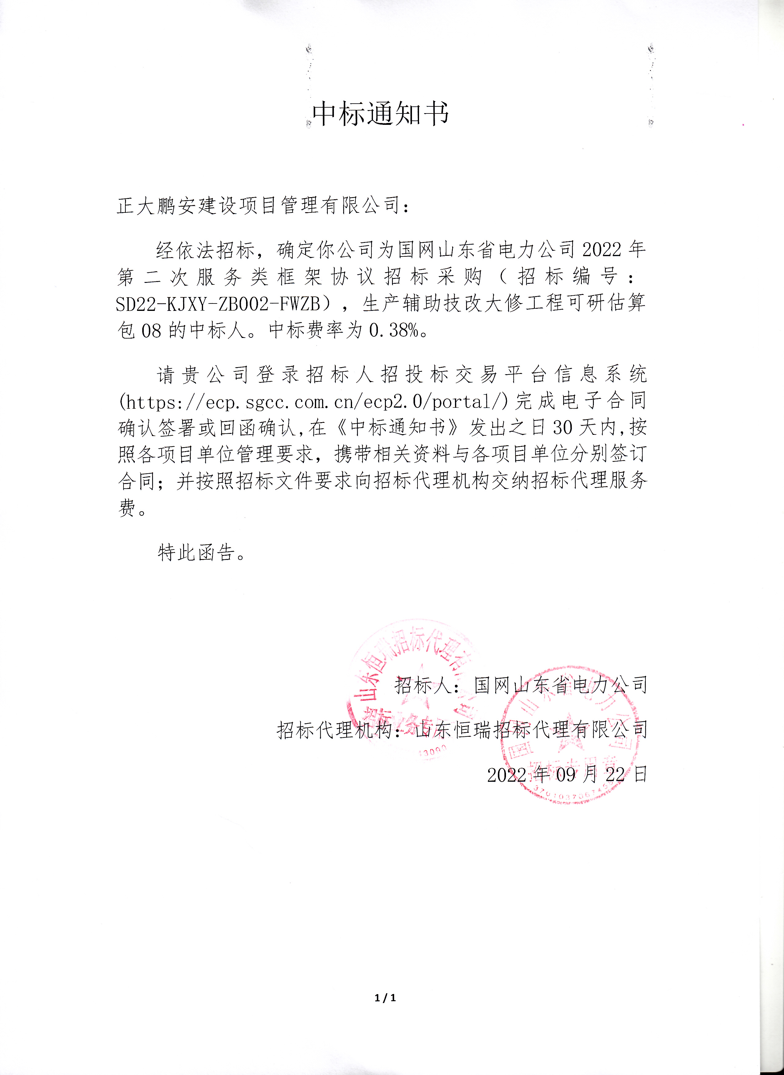近日,我公司參與”國(guó)網(wǎng)山東省電力公司2022年第二次服務(wù)類框架協(xié)議招標(biāo)采購(gòu)中中標(biāo)生產(chǎn)輔助技改大修工程可研估算包08”項(xiàng)目,經(jīng)評(píng)審委員會(huì)綜合評(píng)審,招標(biāo)人確認(rèn),正大鵬安建設(shè)項(xiàng)目管理有限公司中標(biāo)。