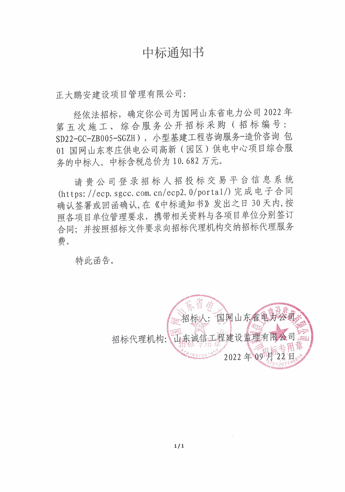 正大鵬安中標(biāo)國網(wǎng)山東省電力公司小型基建工程咨詢服務(wù)-造價(jià)咨詢項(xiàng)目