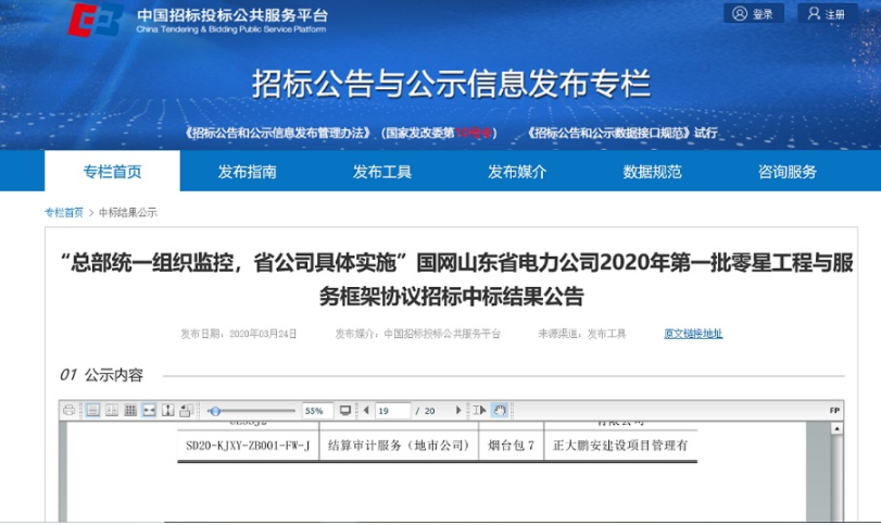 正大鵬安入圍國網(wǎng)山東省電力公司2020年第一批零星工程與服務(wù)框架協(xié)議招標-結(jié)算審計服務(wù)