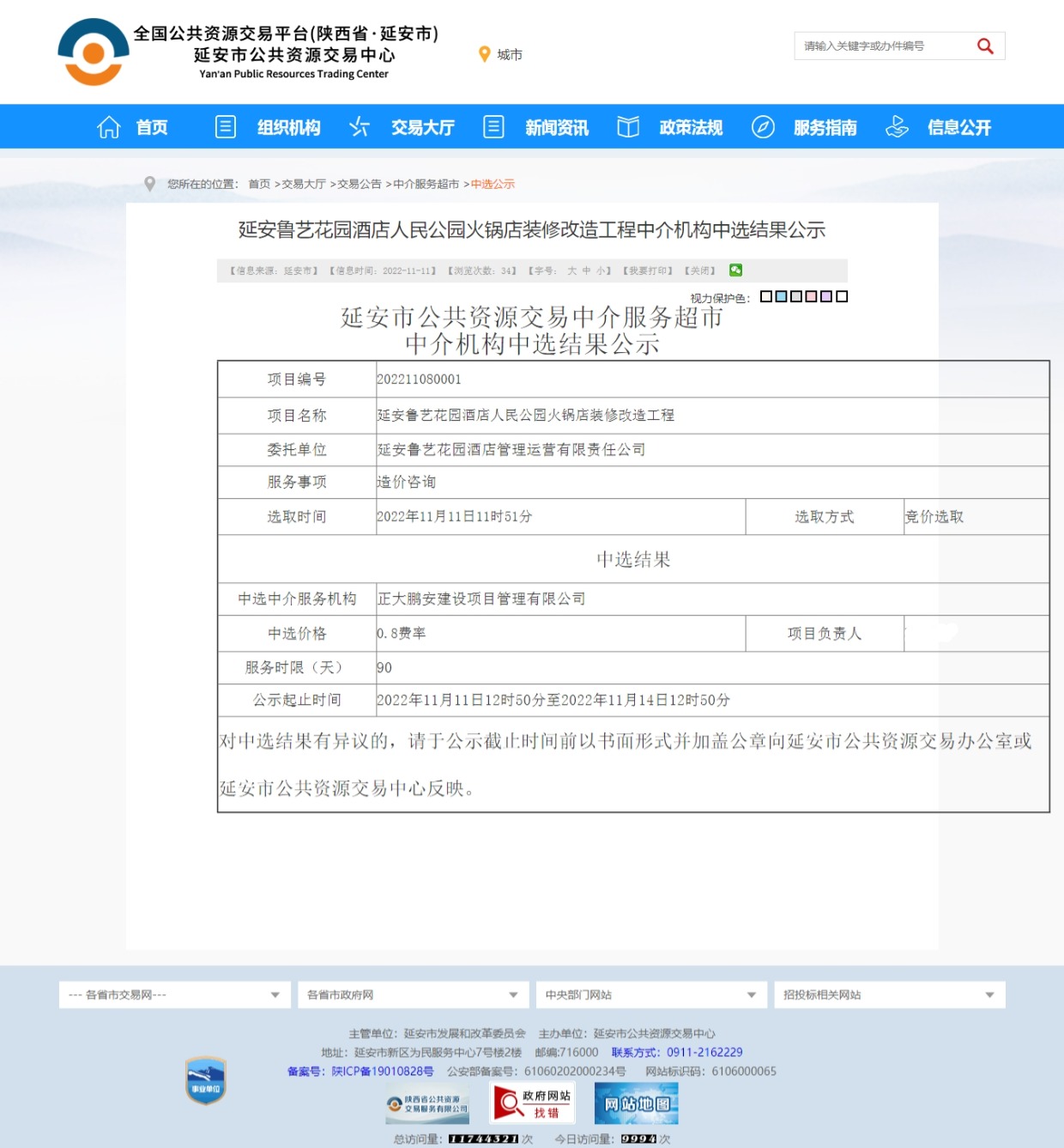 2022年11月11日,正大鵬安建設(shè)項(xiàng)目管理有限公司在延安市公共資源交易中心中介服務(wù)超市機(jī)構(gòu)中選延安魯藝花園酒店人民公園火鍋店裝修改造工程。