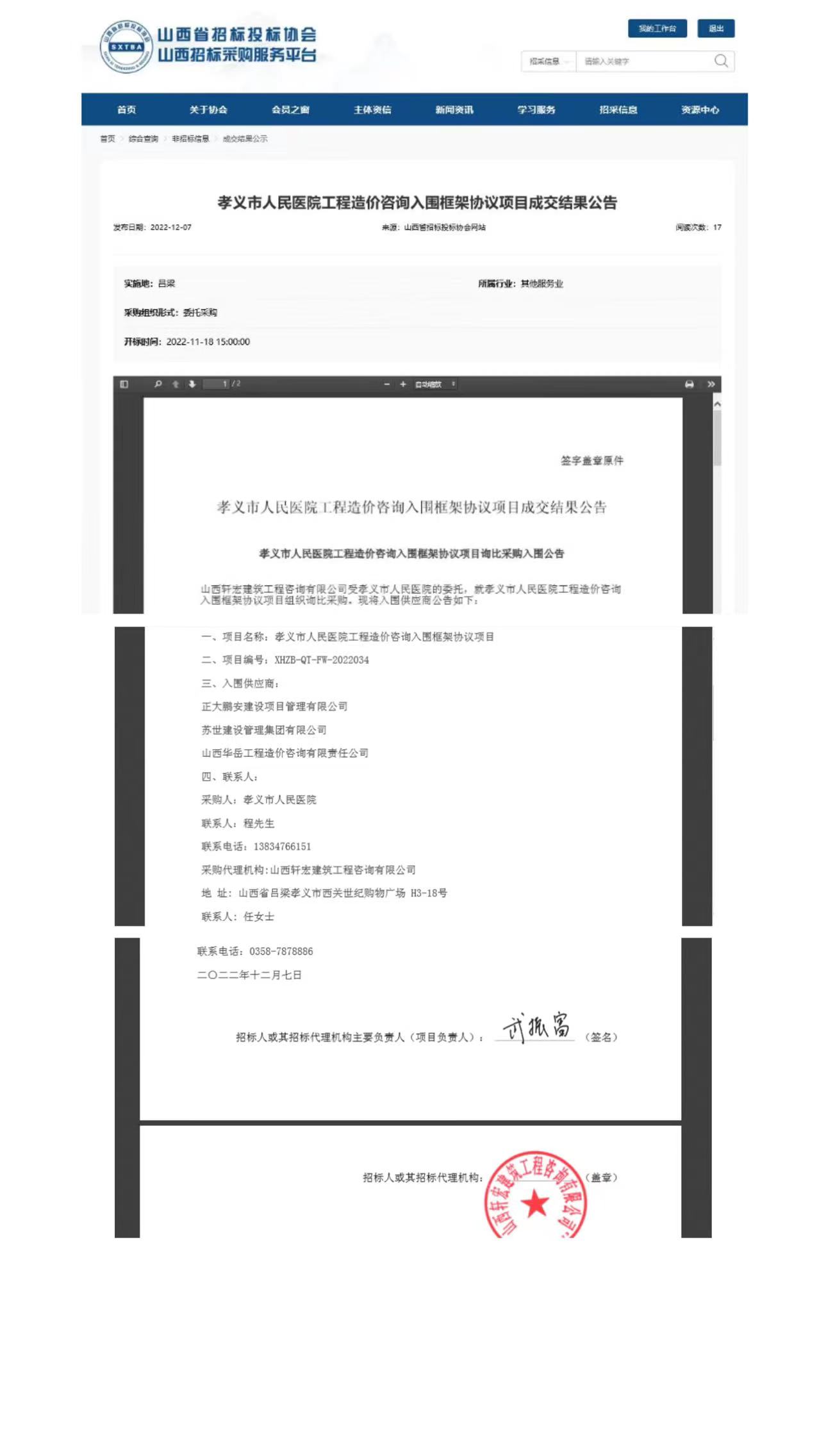 2022年12月,經(jīng)評(píng)標(biāo)委員會(huì)評(píng)定,招標(biāo)人確認(rèn),正大鵬安建設(shè)項(xiàng)目管理有限公司入圍孝義市人民醫(yī)院工程造價(jià)咨詢(xún)?nèi)雵蚣軈f(xié)議項(xiàng)目。