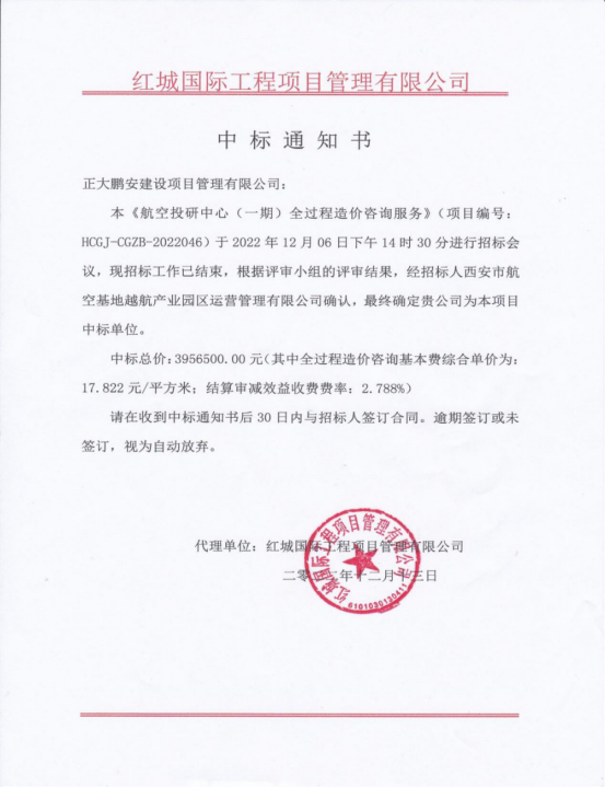 正大鵬安中標航空投研中心(一期)全過程造價咨詢服務 近日,紅城國際工程項目管理有限公司受西安市航空基地越航產業(yè)園運營管理有限公司的委托,對“航空投研中心(一期)全過程造價咨詢服務”項目進行招標。經評標委員會評定,委托方確定,正大鵬安建設項目管理有限公司中標。
