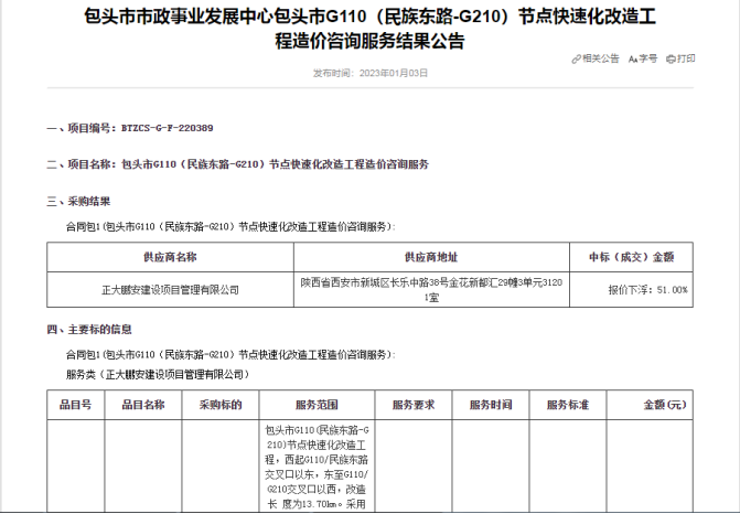 正大鵬安中標(biāo)包頭市G110(民族東路-G210)節(jié)點(diǎn)快速化改造工程造價(jià)咨詢服務(wù)項(xiàng)目