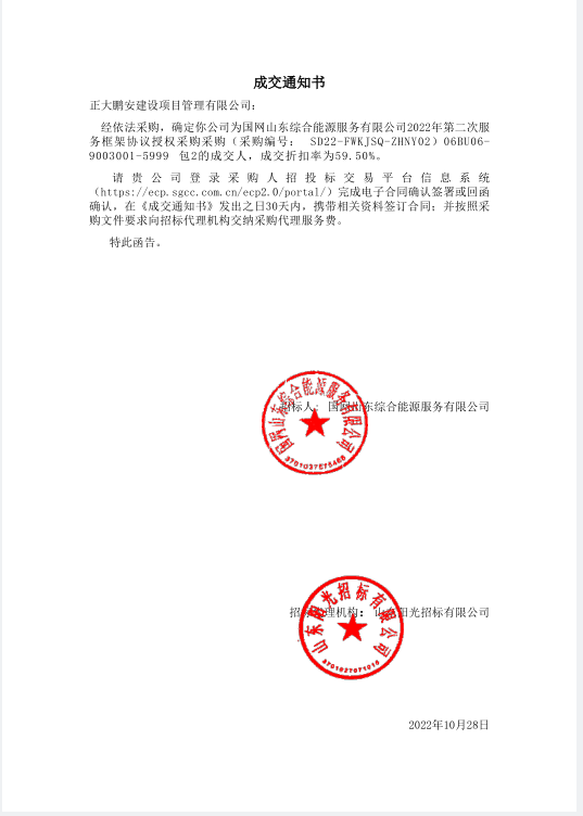 正大鵬安中標(biāo)國(guó)網(wǎng)山東綜合能源服務(wù)有限公司2022年第二次服務(wù)框架協(xié)議授權(quán)采購(gòu)項(xiàng)目