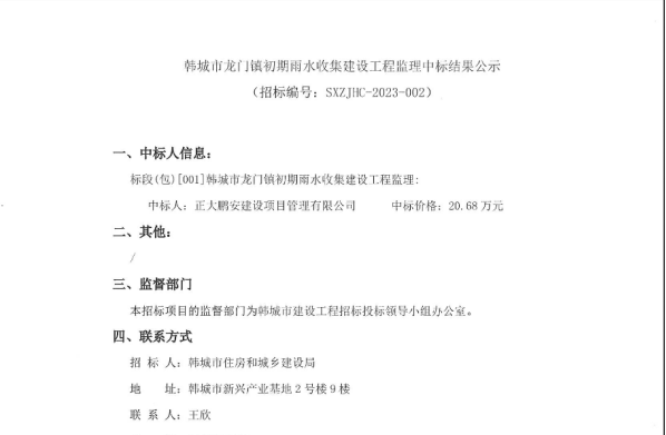 2023年2月,經(jīng)評標委員會評定,招標人確認,正大鵬安建設(shè)項目管理有限公司中標韓城市住房和城鄉(xiāng)建設(shè)局的“韓城市龍門鎮(zhèn)初期雨水收集建設(shè)工程監(jiān)理”項目。