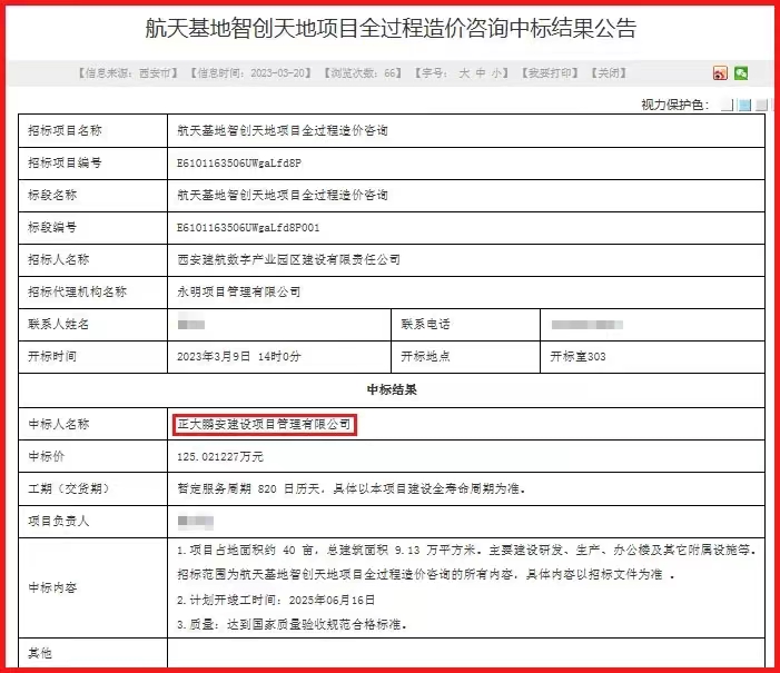 2023年3月,經(jīng)評標委員會評定,招標人確認,正大鵬安建設(shè)項目管理有限公司中標西安建航數(shù)字產(chǎn)業(yè)園區(qū)建設(shè)有限責任公司的“航天基地智創(chuàng)天地項目全過程造價咨詢”項目。