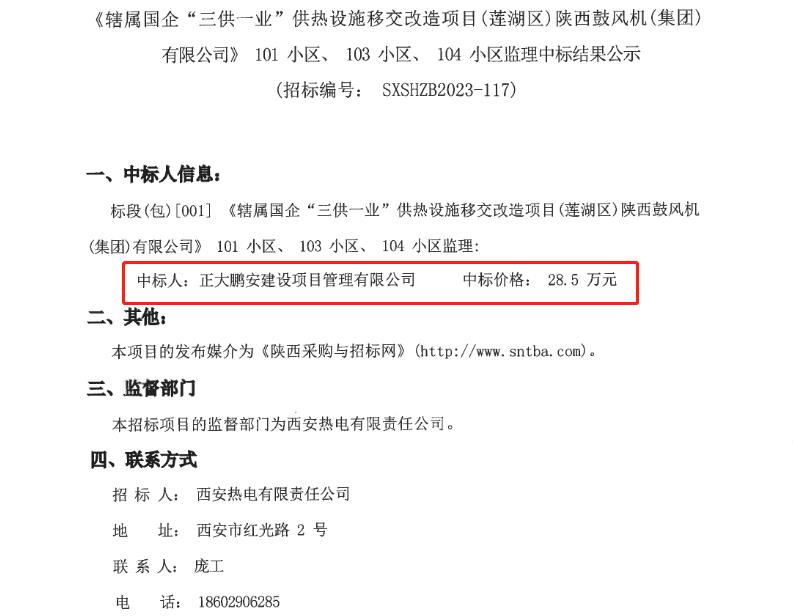 2023年4月,經(jīng)評標(biāo)委員會評定,招標(biāo)人確認(rèn),正大鵬安建設(shè)項目管理有限公司中標(biāo)西安熱電有限責(zé)任公司的“《轄屬國企“三供一業(yè)”供熱設(shè)施移交改造項目(蓮湖區(qū))陜西鼓風(fēng)機(集團)有限公司》101小區(qū)、103小區(qū)、104小區(qū)監(jiān)理”項目。