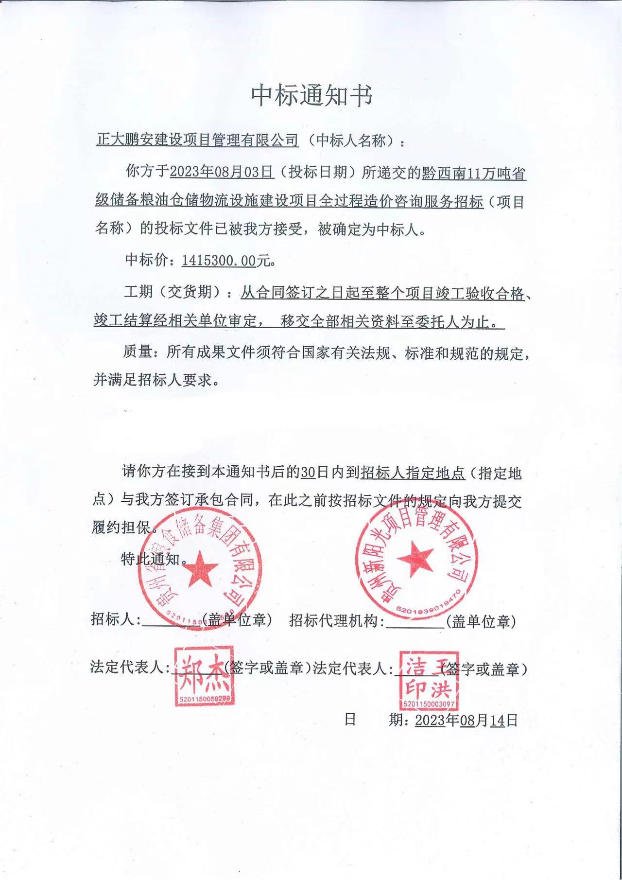 2023年8月,經(jīng)評(píng)標(biāo)委員會(huì)評(píng)定,招標(biāo)人確認(rèn),正大鵬安建設(shè)項(xiàng)目管理有限公司中標(biāo)黔西南11萬(wàn)噸省級(jí)儲(chǔ)備糧油倉(cāng)儲(chǔ)物流設(shè)施建設(shè)項(xiàng)目全過(guò)程造價(jià)咨詢(xún)服務(wù)項(xiàng)目。