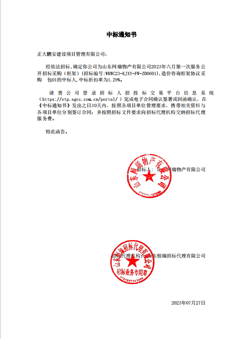 2023年8月,經(jīng)評標(biāo)委員會評定,招標(biāo)人確認(rèn),正大鵬安建設(shè)項目管理有限公司中標(biāo)山東網(wǎng)瑞物產(chǎn)有限公司2023年六月第一次服務(wù)公 開招標(biāo)采購(框架)(招標(biāo)編號:WRWC23-KJXY-FW-ZB0601),造價咨詢框架協(xié)議采購包01的中標(biāo)人。