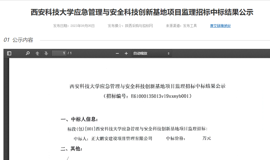 2023年9月,經(jīng)評(píng)標(biāo)委員會(huì)評(píng)定,招標(biāo)人確認(rèn),正大鵬安建設(shè)項(xiàng)目管理有限公司中標(biāo)西安科技大學(xué)的“西安科技大學(xué)應(yīng)急管理與安全科技創(chuàng)新基地項(xiàng)目監(jiān)理”。