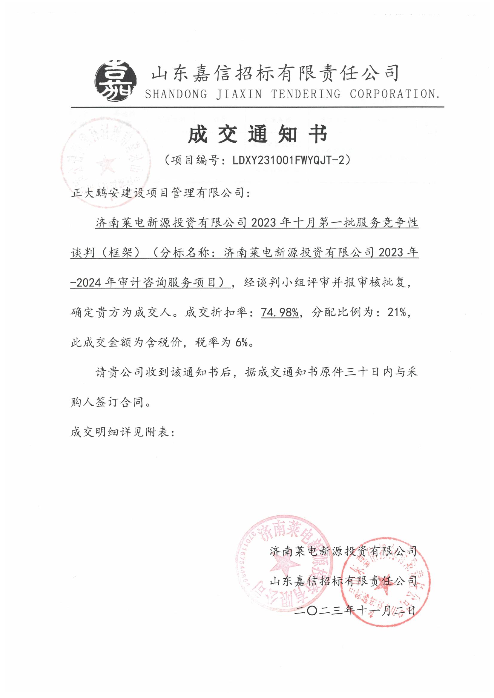 2023年11月,經(jīng)評(píng)標(biāo)委員會(huì)評(píng)定,招標(biāo)人確認(rèn),正大鵬安建設(shè)項(xiàng)目管理有限公司中標(biāo)“濟(jì)南萊電新源投資有限公司2023年十月第一批服務(wù)競爭性談判(框架)(分標(biāo)名稱:濟(jì)南萊電新源投資有限公司2023年-2024 年審計(jì)咨詢服務(wù)項(xiàng)目)”。