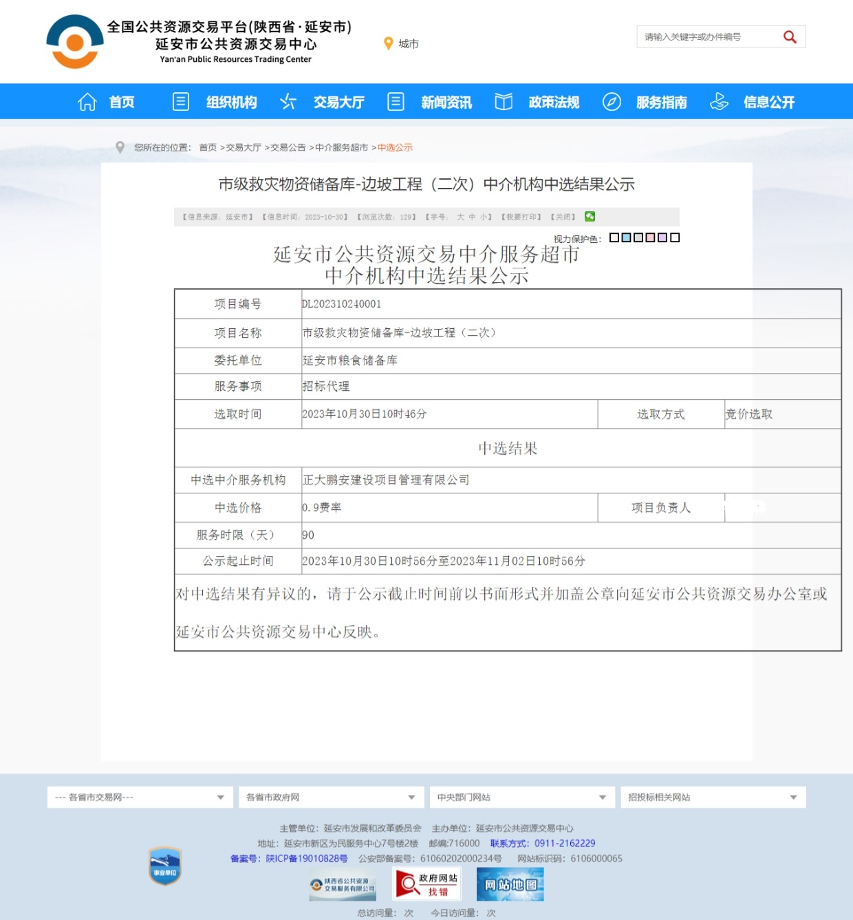 2023年10月30日,正大鵬安建設(shè)項(xiàng)目管理有限公司在延安市公共資源交易中心中介服務(wù)超市機(jī)構(gòu)中選市級救災(zāi)物資儲(chǔ)備庫-邊坡工程(二次)項(xiàng)目。