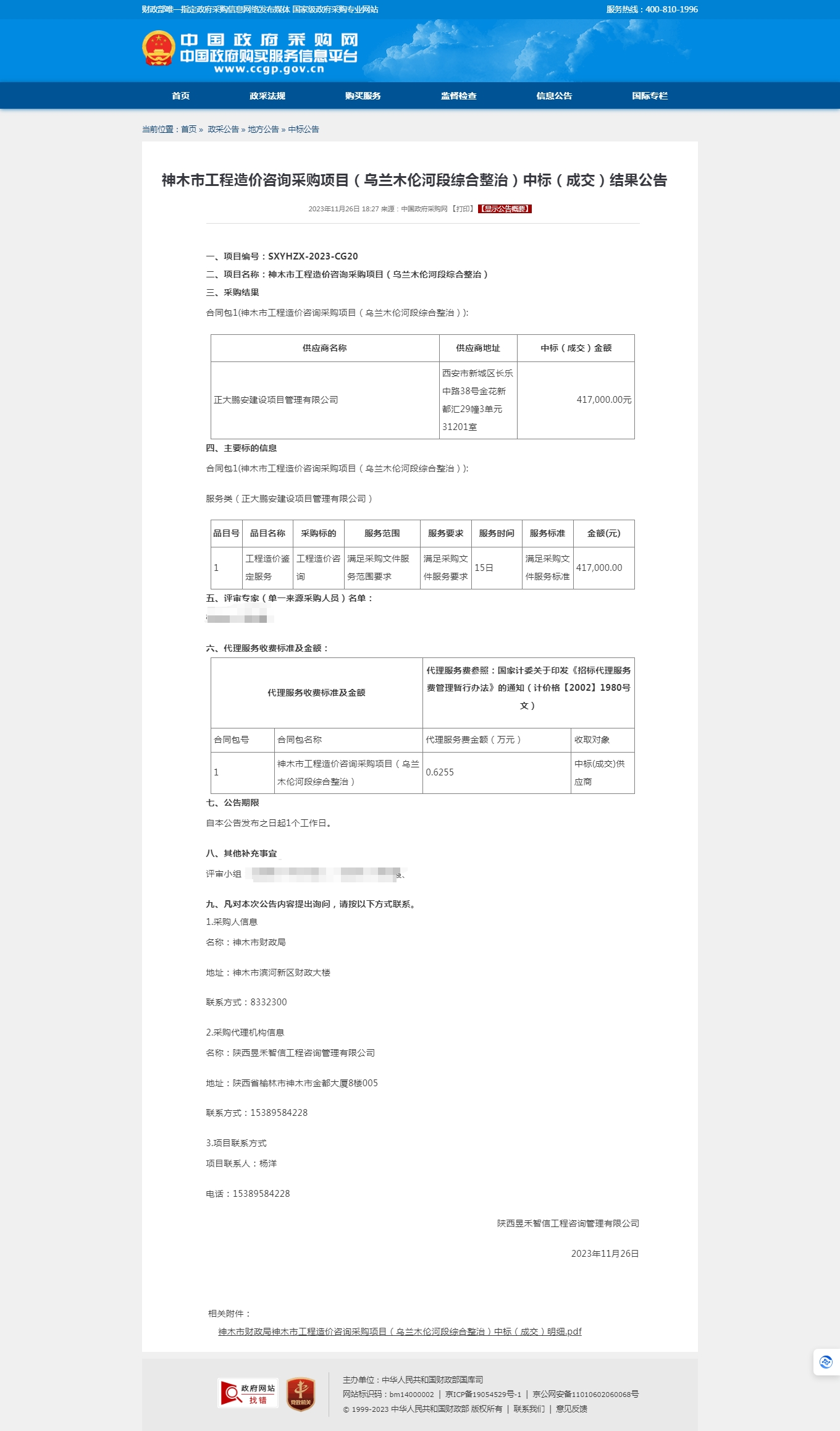 2023年11月,經(jīng)評標(biāo)委員會評定,招標(biāo)人確認(rèn),正大鵬安建設(shè)項目管理有限公司中標(biāo)“神木市工程造價咨詢采購項目(烏蘭木倫河段綜合整治)”。