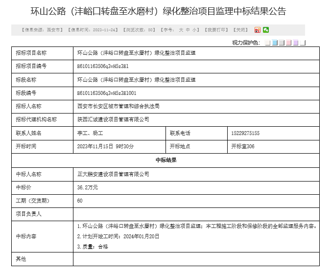 2023年11月,經(jīng)評標(biāo)委員會評定,招標(biāo)人確認(rèn),正大鵬安建設(shè)項目管理有限公司中標(biāo)西安市長安區(qū)城市管理和綜合執(zhí)法局的“環(huán)山公路(灃峪口轉(zhuǎn)盤至水磨村)綠化整治項目監(jiān)理”項目。