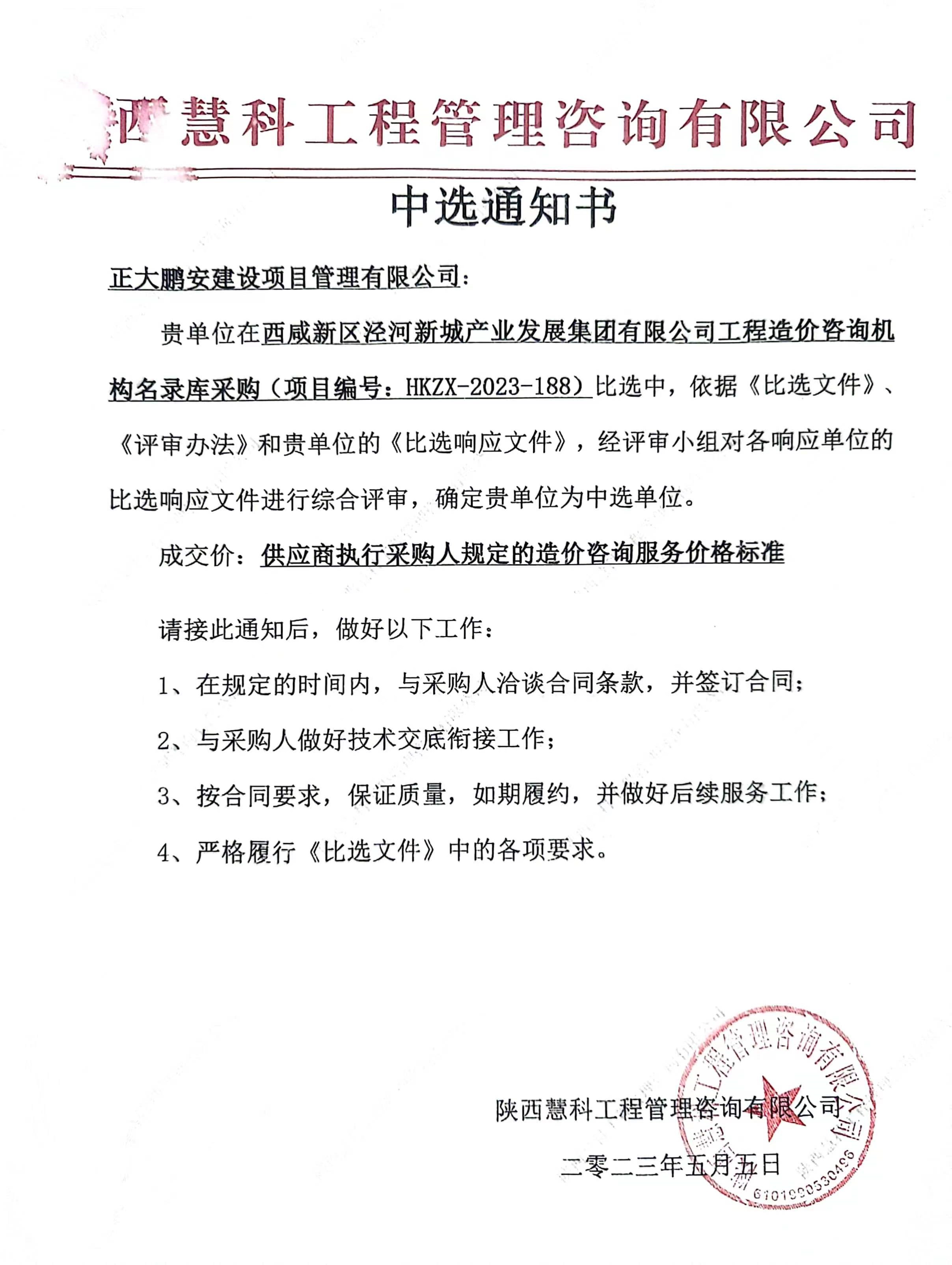 2023年5月,經(jīng)評標(biāo)委員會評定,招標(biāo)人確認(rèn),正大鵬安建設(shè)項(xiàng)目管理有限公司中標(biāo)“西咸新區(qū)涇河新城產(chǎn)業(yè)發(fā)展集團(tuán)有限公司工程造價(jià)咨詢機(jī)構(gòu)名錄庫采購”。