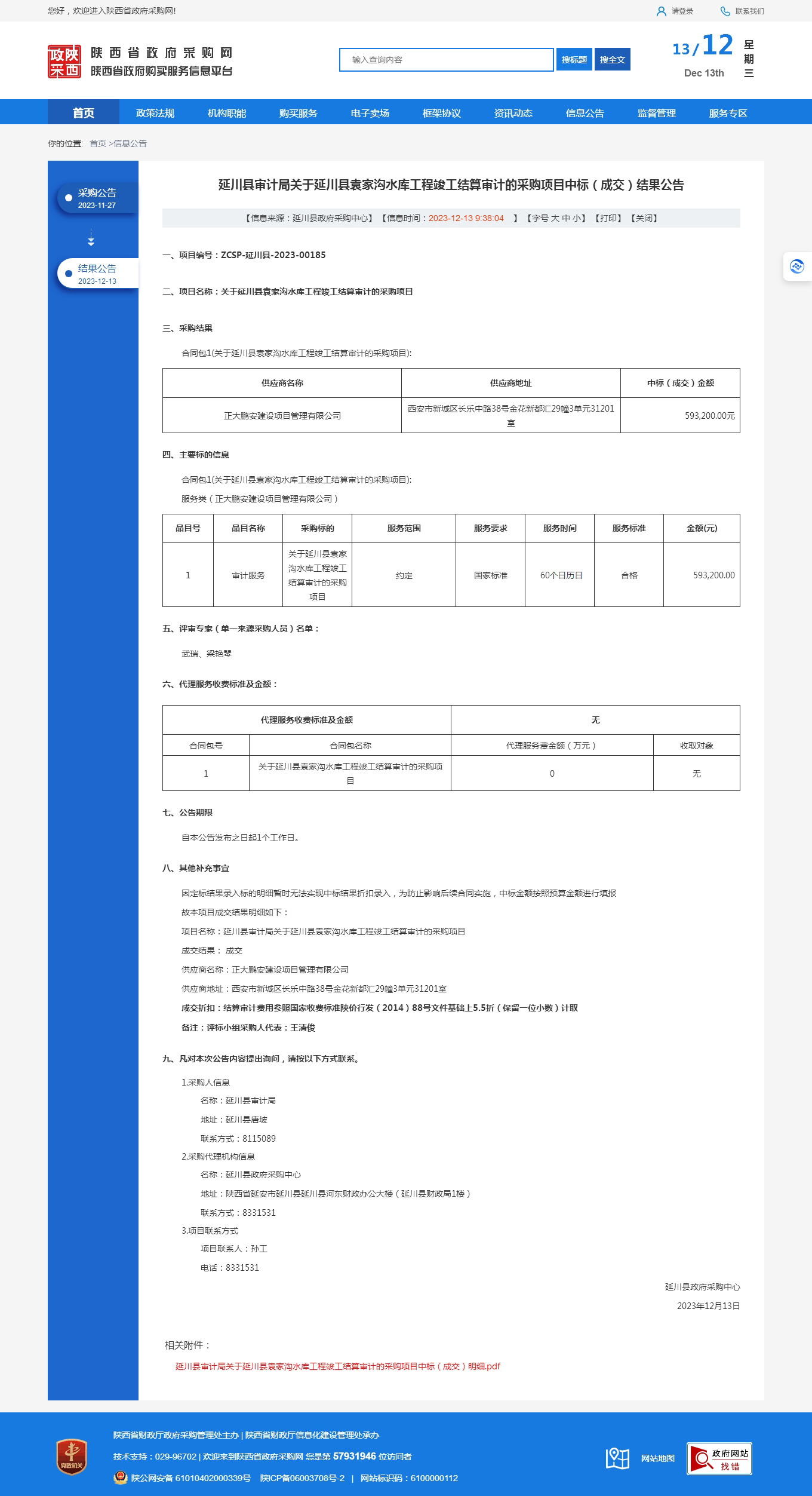 2023年12月,經評標委員會綜合評審,招標人確認,正大鵬安建設項目管理有限公司中標“延川縣審計局關于延川縣袁家溝水庫工程竣工結算審計的采購項目”。