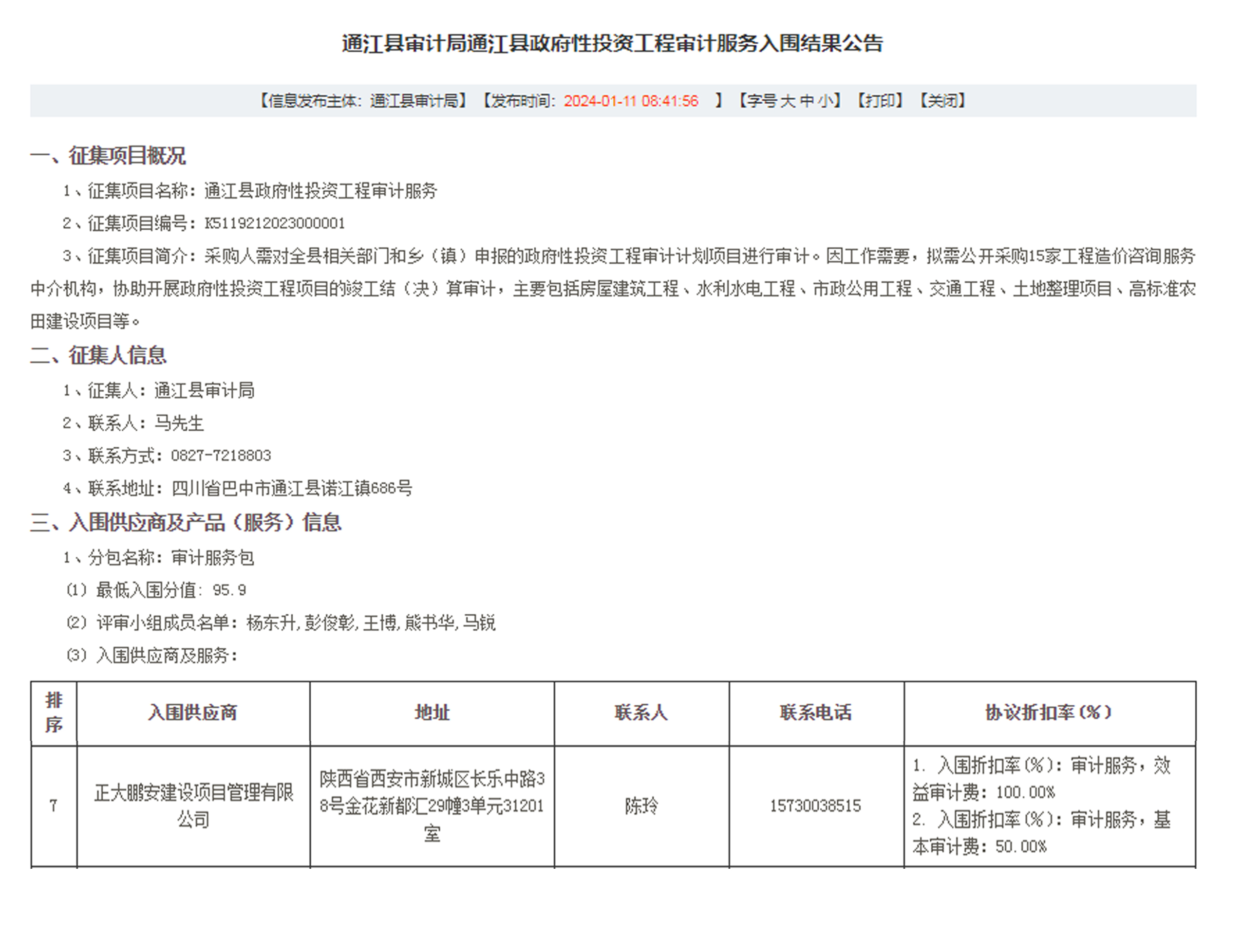 正大鵬安中標(biāo)通江縣審計(jì)局通江縣政府性投資工程審計(jì)服務(wù)入圍項(xiàng)目