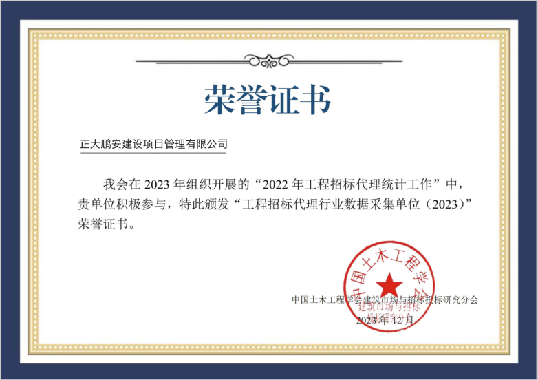 熱烈祝賀正大鵬安公司榮獲“工程招標(biāo)代理行業(yè)數(shù)據(jù)采集單位(2023)”榮譽(yù)證書