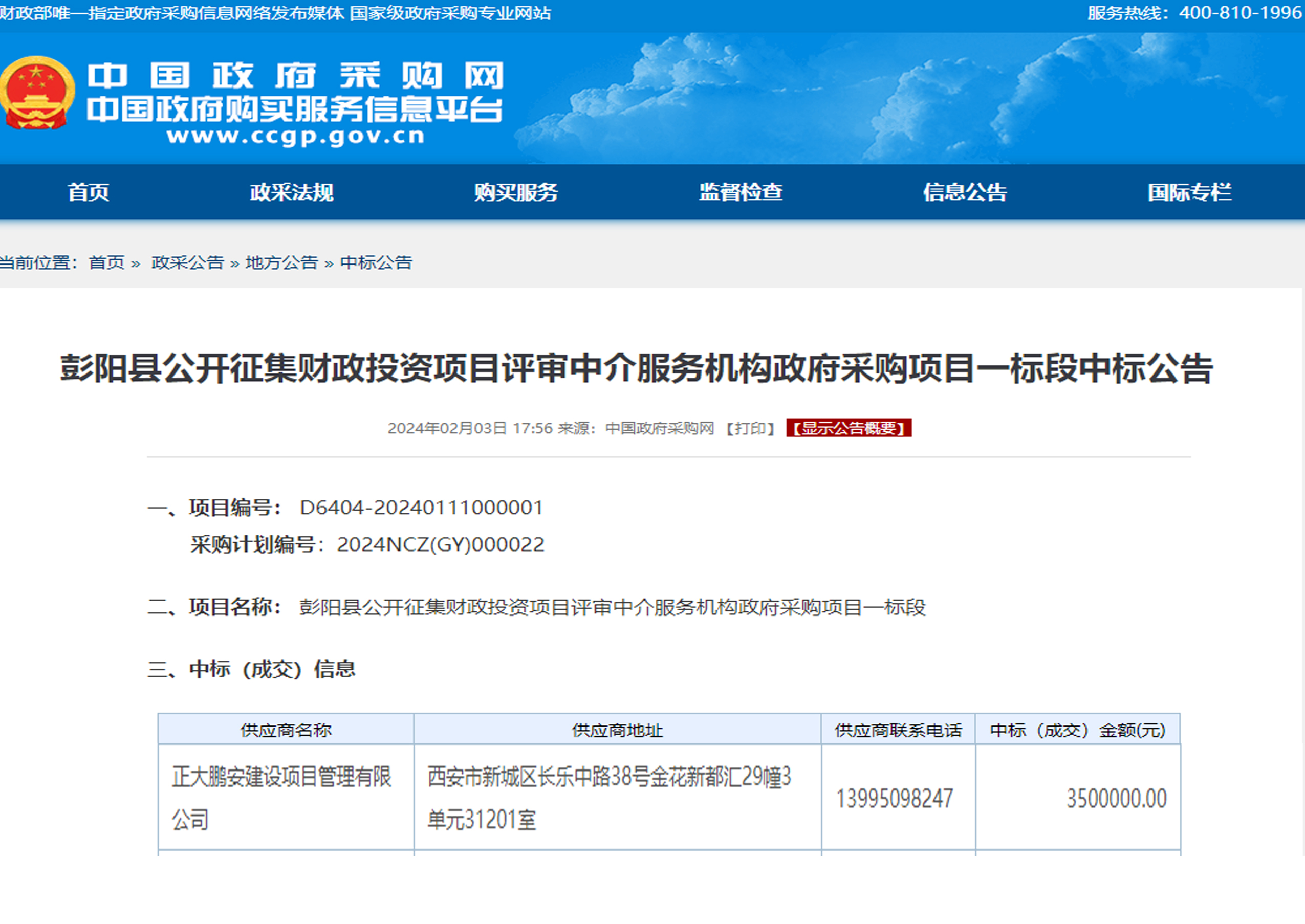 2024年2月,經(jīng)評(píng)標(biāo)委員會(huì)綜合評(píng)審,招標(biāo)人確認(rèn),正大鵬安建設(shè)項(xiàng)目管理有限公司中標(biāo)“彭陽縣公開征集財(cái)政投資項(xiàng)目評(píng)審中介服務(wù)機(jī)構(gòu)政府采購項(xiàng)目一標(biāo)段”。