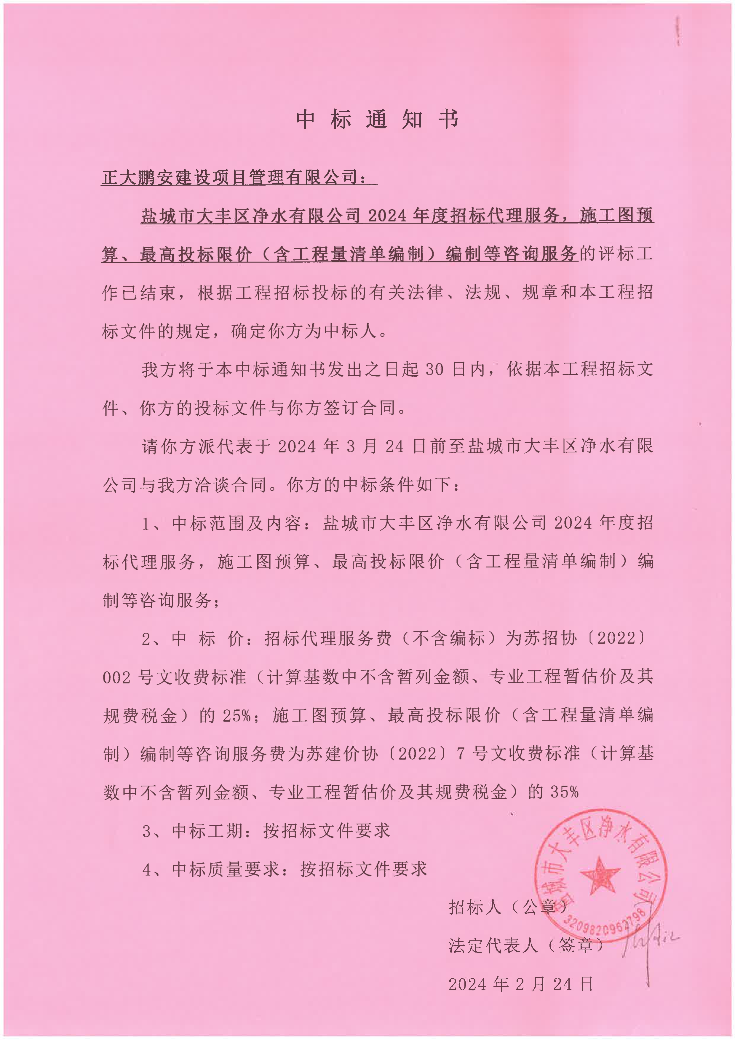 正大鵬安中標(biāo)鹽城市大豐區(qū)凈水有限公司2024年度招標(biāo)代理服務(wù),施工圖預(yù)算、最高投標(biāo)限價(jià)(含工程量清單編制)編制等咨詢服務(wù)項(xiàng)目