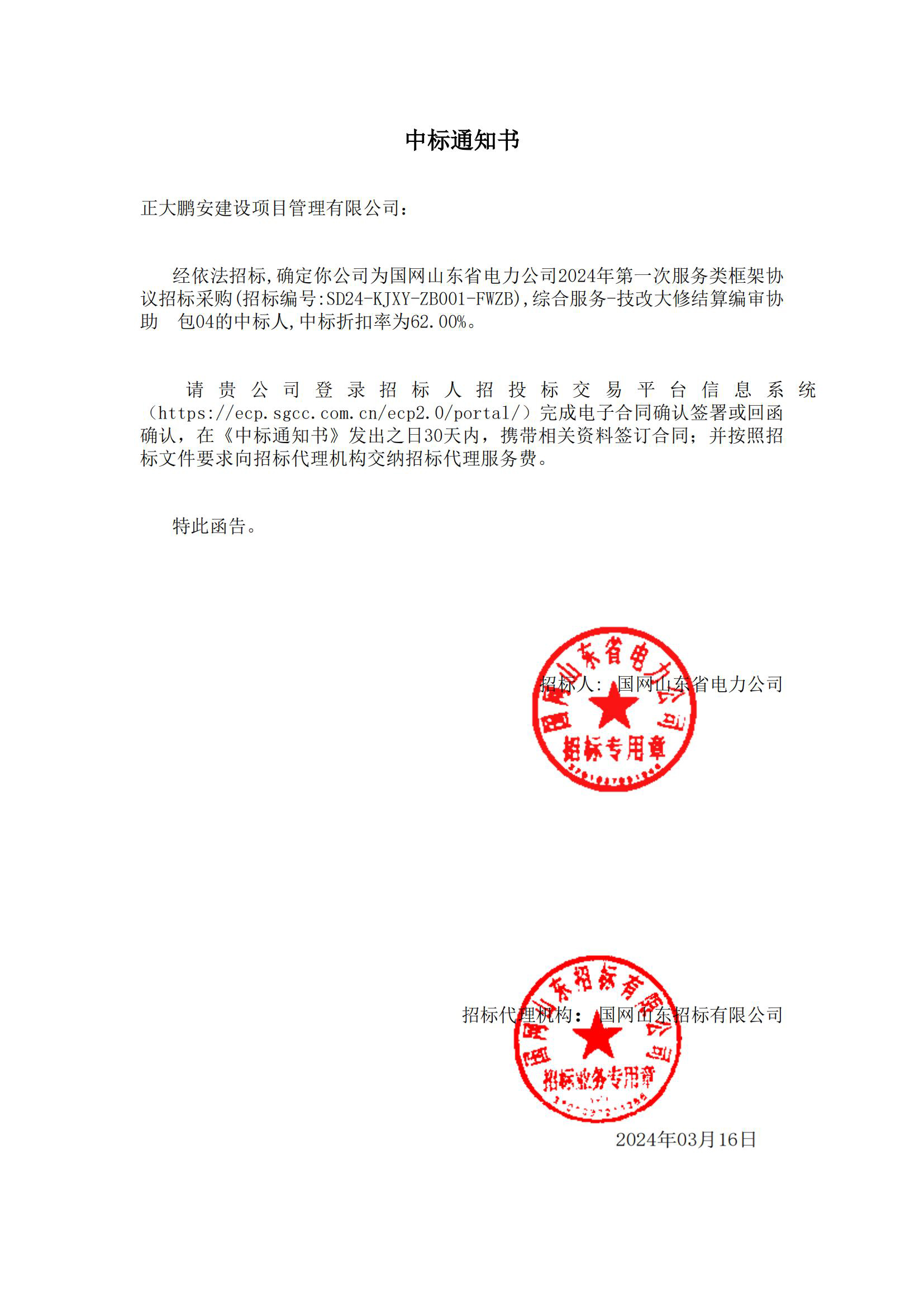 2024年3月,經(jīng)評標委員會綜合評審,招標人確認,正大鵬安建設項目管理有限公司中標“國網(wǎng)山東省電力公司2024年第一次服務類框架協(xié)議招標采購(招標編號:SD24-KJXY-ZB001-FWZB),綜合服務-技改大修結算編審協(xié)助包04”。