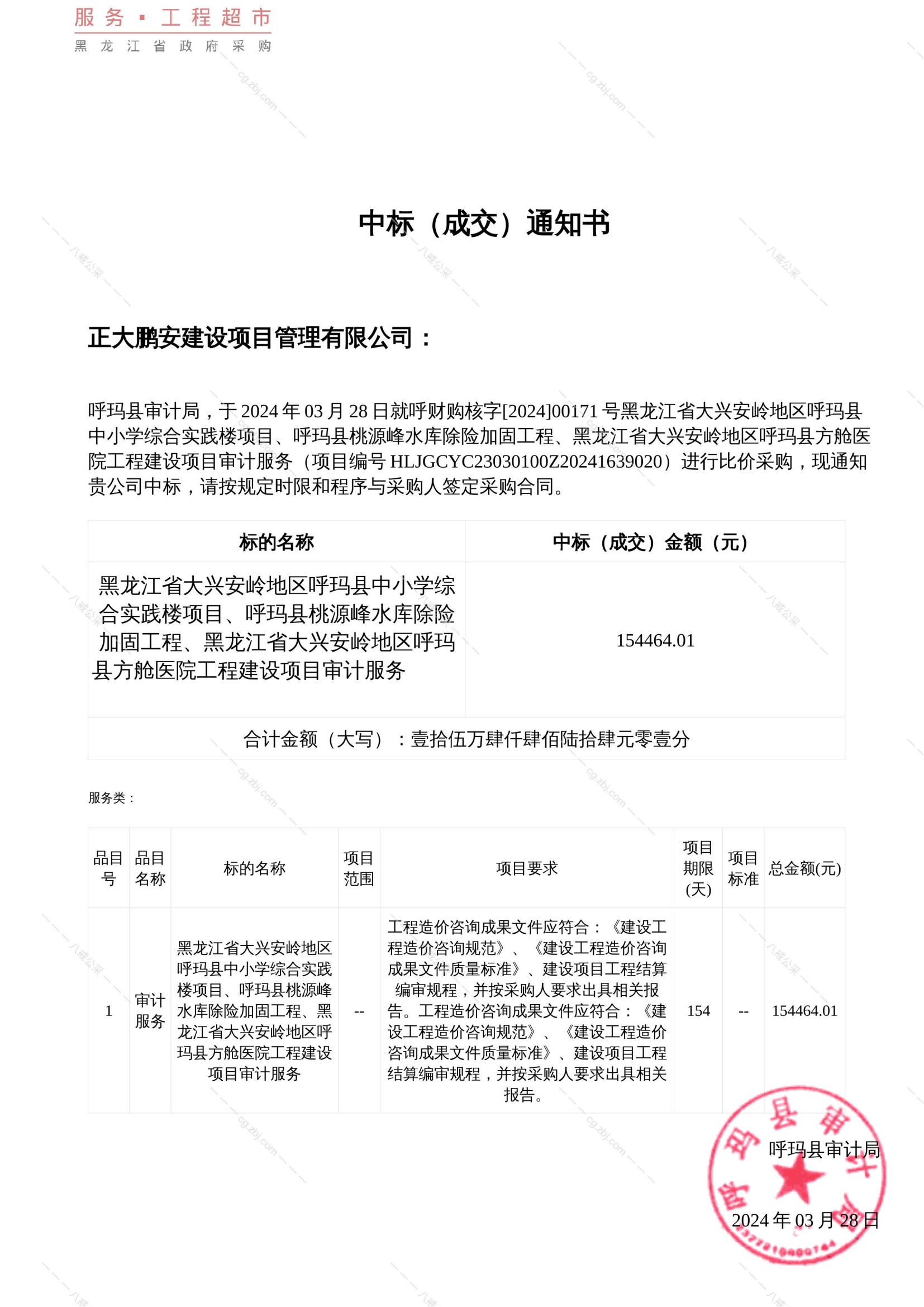 2024年3月,經(jīng)評標(biāo)委員會綜合評審,招標(biāo)人確認(rèn),正大鵬安建設(shè)項目管理有限公司中標(biāo)“黑龍江省大興安嶺地區(qū)呼瑪縣中小學(xué)綜合實踐樓項目、呼瑪縣桃源峰水庫除險加固工程、黑龍江省大興安嶺地區(qū)呼瑪縣方艙醫(yī)院工程建設(shè)項目審計服務(wù)”。
