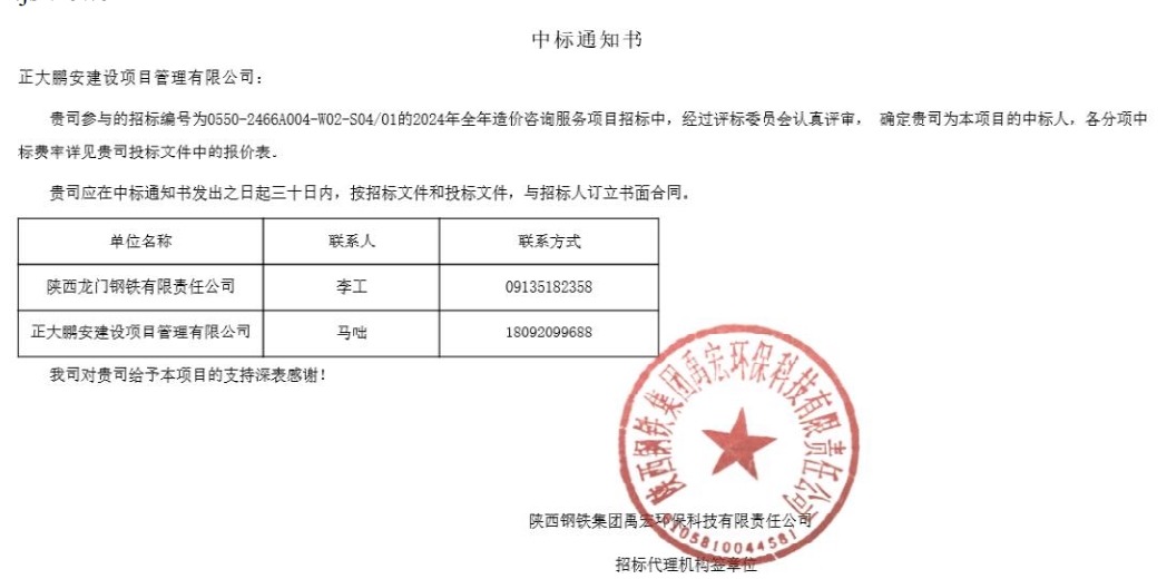正大鵬安中標(biāo)陜西龍門鋼鐵2024年全年造價咨詢服務(wù)項目