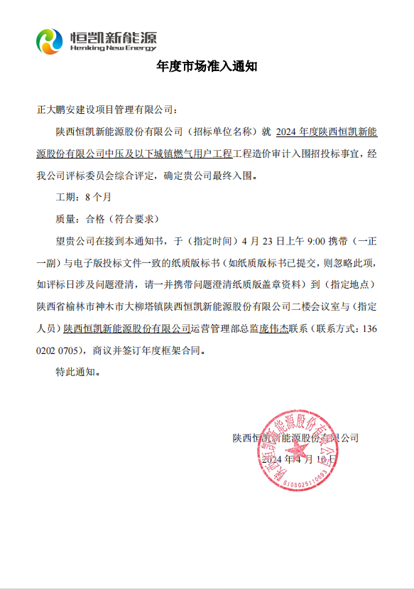 2024年4月10日,經(jīng)評標委員會綜合評審,招標人確認,正大鵬安建設(shè)項目管理有限公司入圍“2024年度陜西恒凱新能源中壓及以下城鎮(zhèn)燃氣用戶項目工程造價審計”。