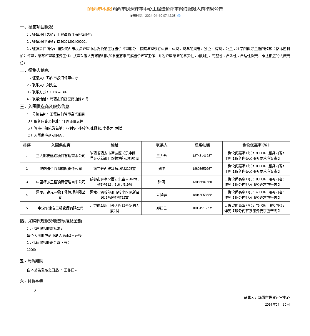2024年4月10日,經(jīng)評標(biāo)委員會綜合評審,招標(biāo)人確認(rèn),正大鵬安建設(shè)項(xiàng)目管理有限公司中標(biāo)“雞西市工程造價評審咨詢服務(wù)項(xiàng)目”。