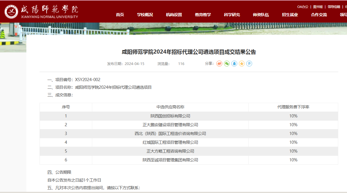 正大鵬安入圍咸陽(yáng)師范學(xué)院2024年招標(biāo)代理公司遴選項(xiàng)目