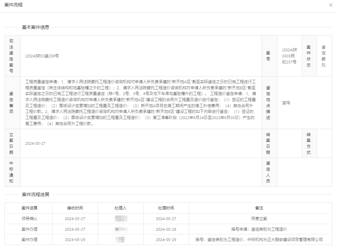 2024年5月27日,經(jīng)寶雞市中級(jí)人民法院確認(rèn),正大鵬安建設(shè)項(xiàng)目管理有限公司中標(biāo)“原告中建三局集團(tuán)有限公司與被告陜西東嶺房地產(chǎn)開發(fā)有限公司、東嶺集團(tuán)股份有限公司建設(shè)工程施工合同糾紛一案”司法鑒定項(xiàng)目。