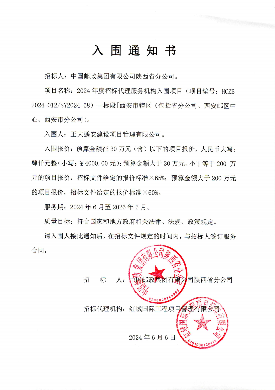 正大鵬安入圍中國郵政2024年度招標(biāo)代理服務(wù)機(jī)構(gòu)項(xiàng)目