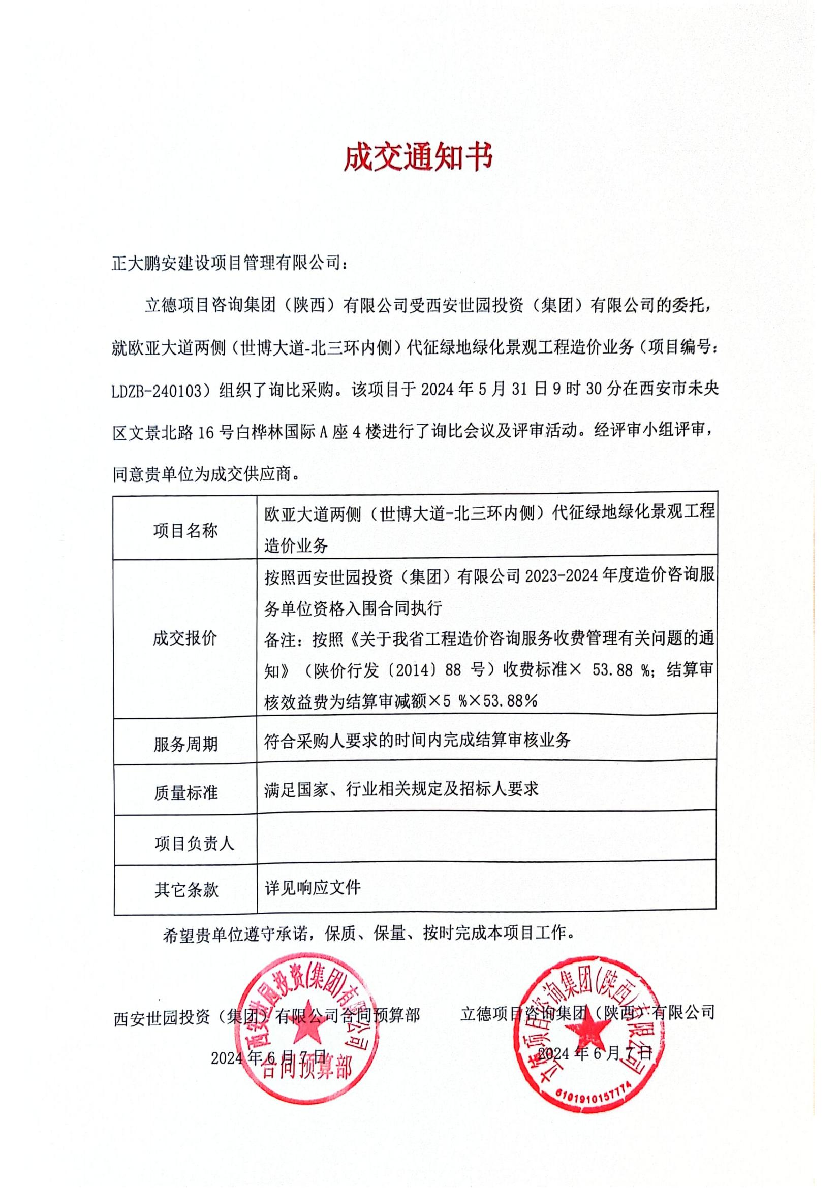 2024年5月31日,經(jīng)評標委員會綜合評審,招標人確認,正大鵬安建設項目管理有限公司中標“歐亞大道兩側(cè)(世博大道-北三環(huán)內(nèi)側(cè))代征綠地綠化景觀工程造價業(yè)務”項目。