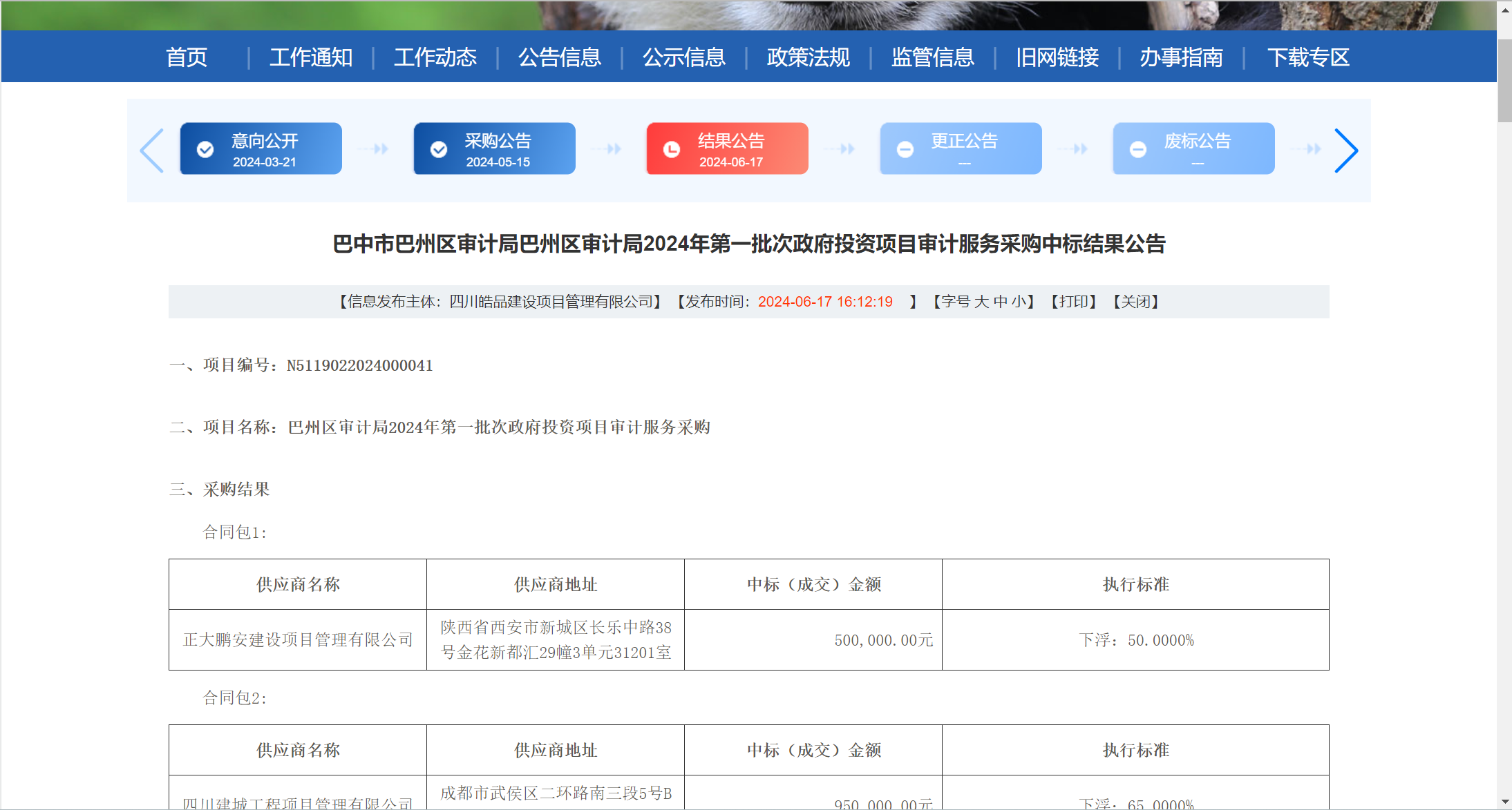 2024年6月17日,經(jīng)評標(biāo)委員會綜合評審,招標(biāo)人確認,正大鵬安建設(shè)項目管理有限公司中標(biāo)“巴中市巴州區(qū)審計局2024年第一批次政府投資項目審計服務(wù)采購”