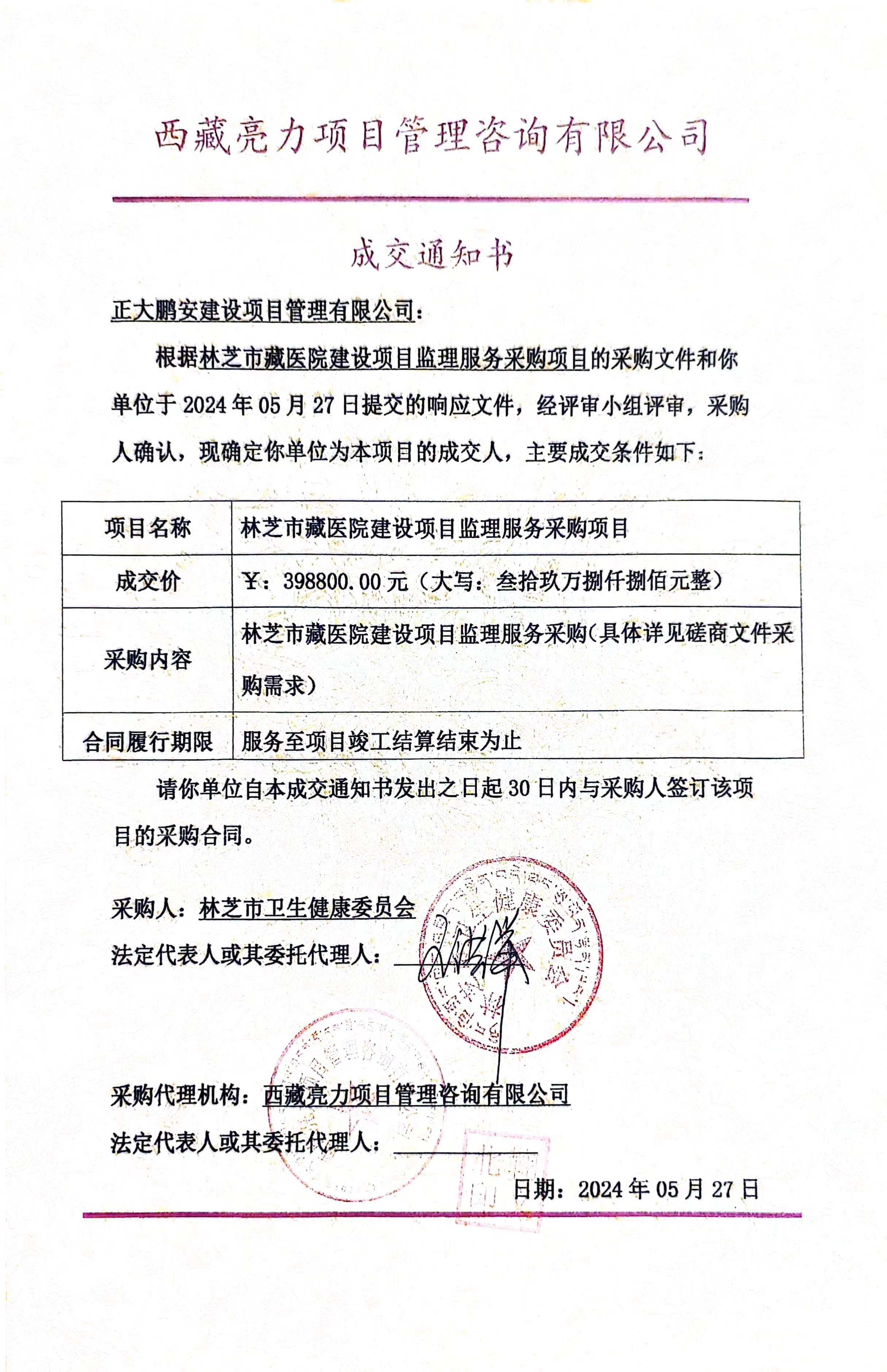 2024年5月27日,經(jīng)評標(biāo)委員會評定,招標(biāo)人確認(rèn),正大鵬安建設(shè)項(xiàng)目管理有限公司中標(biāo)“林芝市藏醫(yī)院建設(shè)項(xiàng)目監(jiān)理服務(wù)采購項(xiàng)目”。