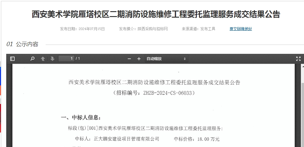 2024年7月13日,經(jīng)評(píng)標(biāo)委員會(huì)綜合評(píng)審,招標(biāo)人確認(rèn),正大鵬安建設(shè)項(xiàng)目管理有限公司中標(biāo)西安美術(shù)學(xué)院雁塔校區(qū)二期消防設(shè)施維修工程委托監(jiān)理服務(wù)。