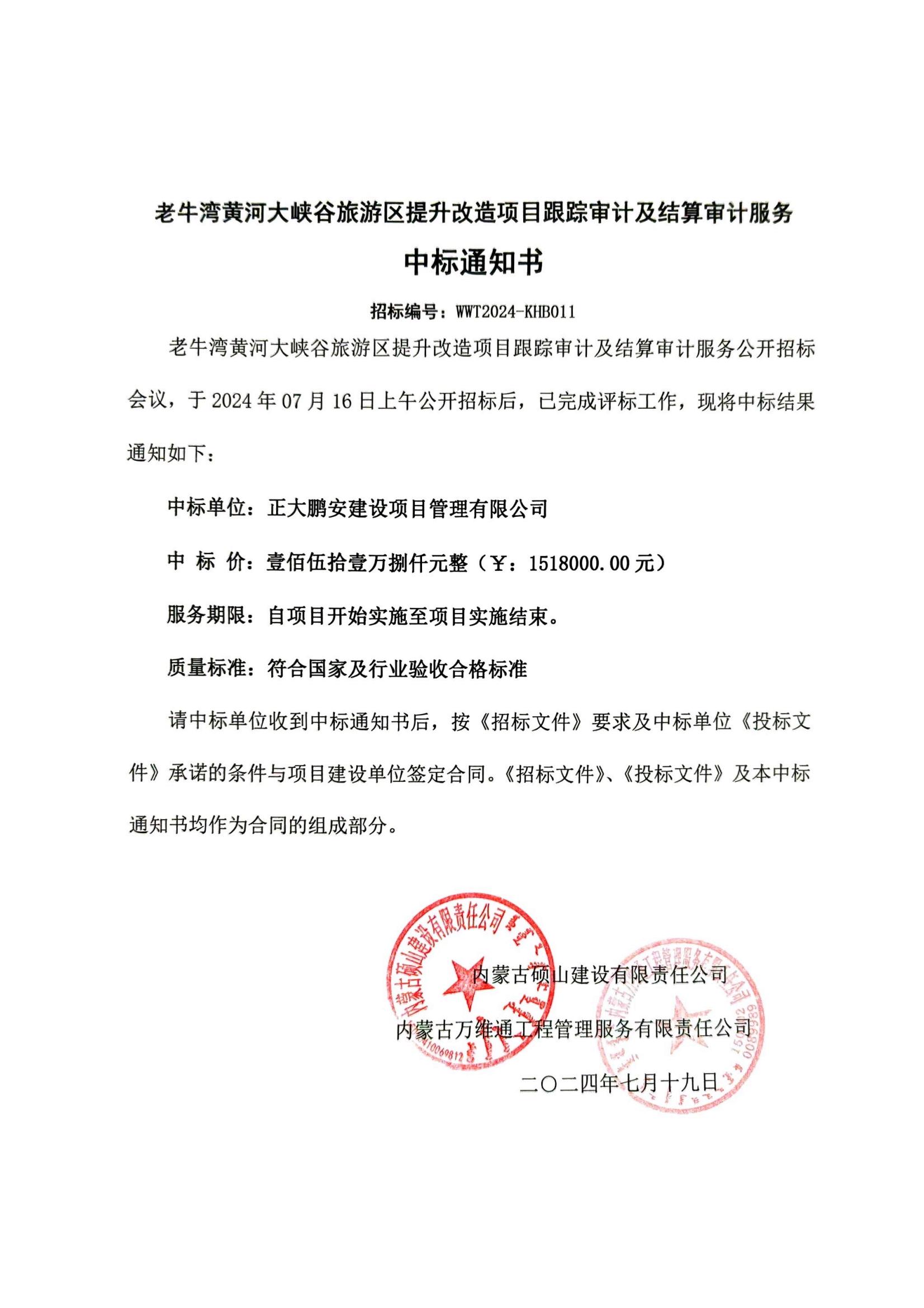 2024年7月16日,經(jīng)評標(biāo)委員會綜合評審,招標(biāo)人確認(rèn),正大鵬安建設(shè)項目管理有限公司中標(biāo)“老牛灣黃河大峽谷旅游區(qū)提升改造項目跟蹤審計及結(jié)算審計服務(wù)項目”。