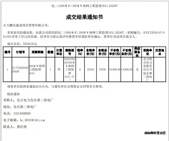 2024年7月16日,經(jīng)評(píng)標(biāo)委員會(huì)綜合評(píng)審,招標(biāo)人確認(rèn),正大鵬安建設(shè)項(xiàng)目管理有限公司中標(biāo)包二(1000MW)200MW熱網(wǎng)工程監(jiān)理。