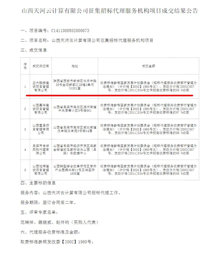 2024年7月22日,經(jīng)評(píng)標(biāo)委員會(huì)綜合評(píng)審,招標(biāo)人確認(rèn),正大鵬安建設(shè)項(xiàng)目管理有限公司中標(biāo)“山西天河云計(jì)算有限公司征集招標(biāo)代理服務(wù)機(jī)構(gòu)項(xiàng)目”。