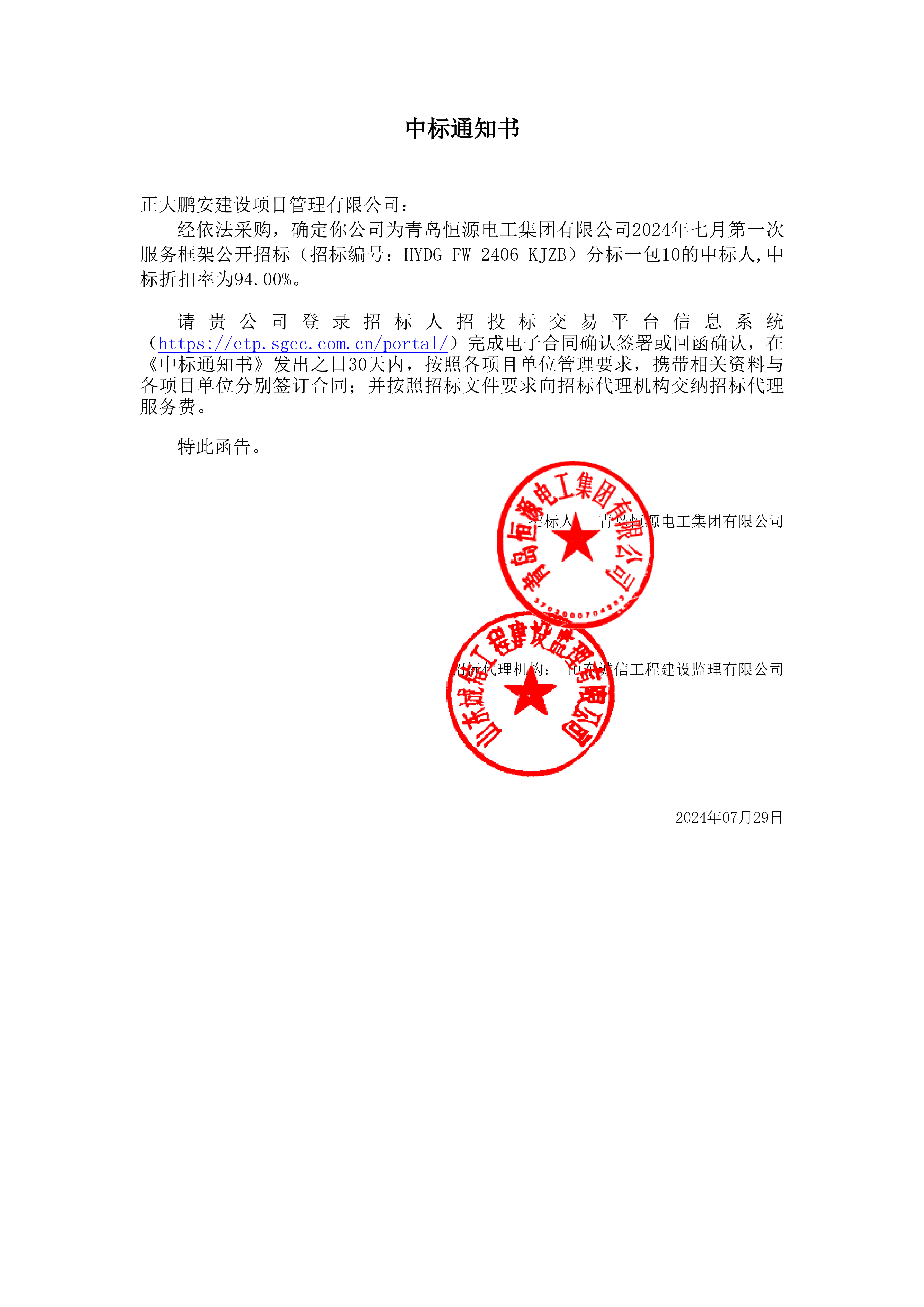 2024年7月26日,經(jīng)評(píng)標(biāo)委員會(huì)綜合評(píng)審,招標(biāo)人確認(rèn),正大鵬安建設(shè)項(xiàng)目管理有限公司中標(biāo)“青島恒源電工集團(tuán)有限公司2024年七月第一次服務(wù)框架公開招標(biāo)(招標(biāo)編號(hào):HYDG-FW-2406-KJZB)分標(biāo)一包10”。